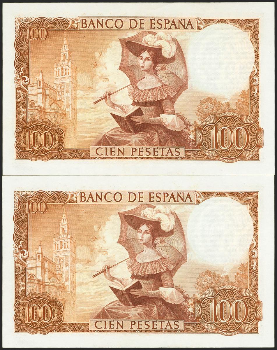100 Pesetas. 19 de Noviembre de 1965. Pareja correlativa. Sin serie. (Edifil 2021: 470). Conserva todo su apresto original. SC.