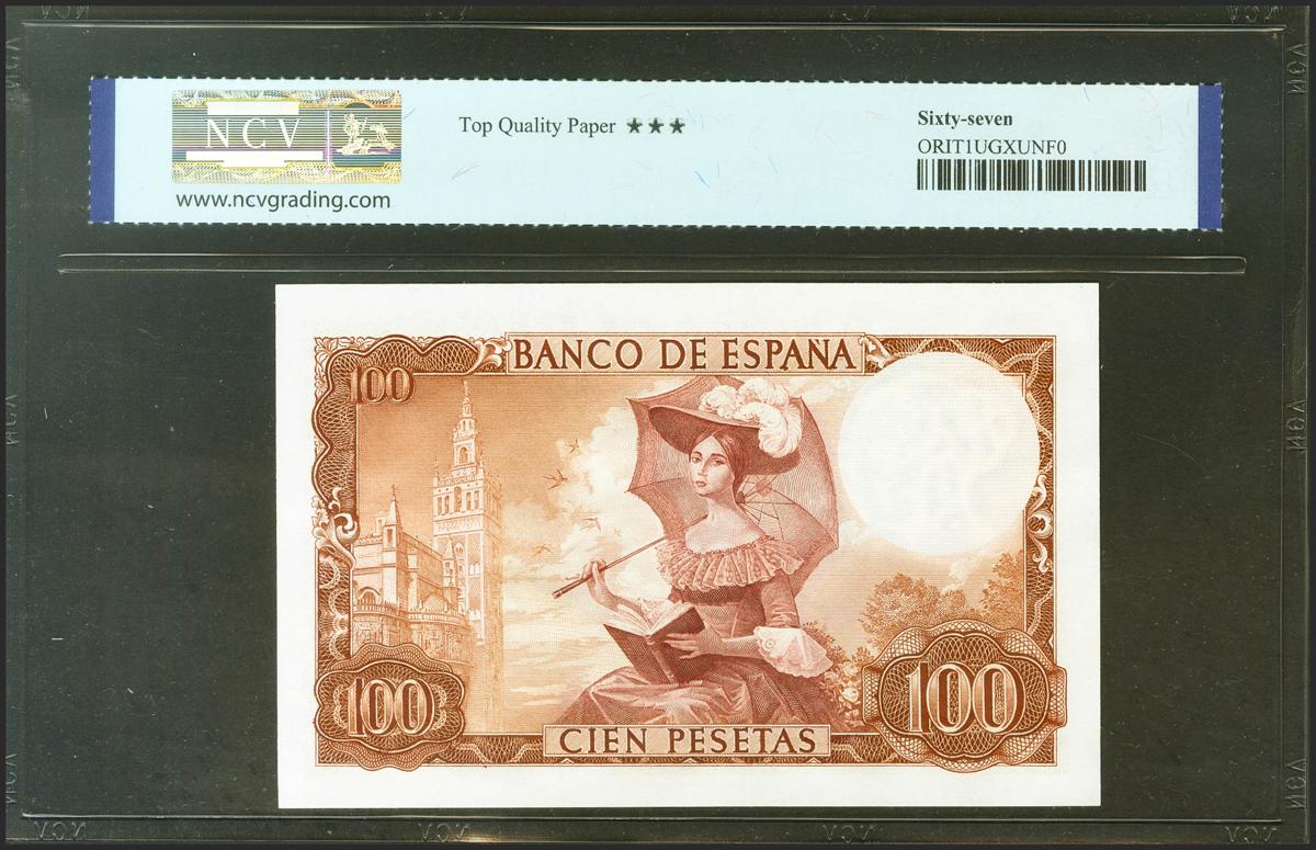 100 Pesetas. 19 de Noviembre de 1965. Serie B. (Edifil 2021: 470a, Pick: 150). Raro en esta excepcional calidad, apresto original. Encapsulado NCV67TQP.