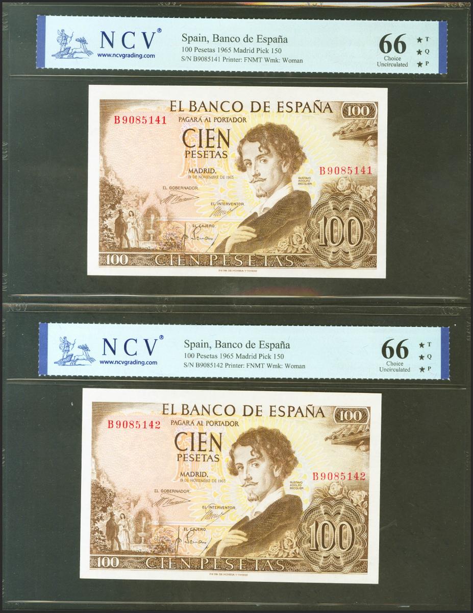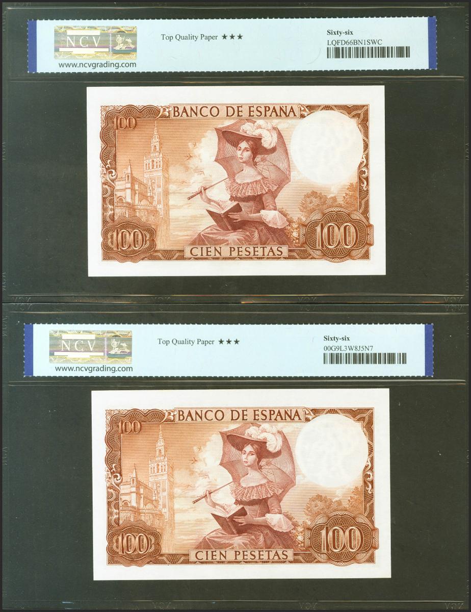100 Pesetas. 19 de Noviembre de 1965. Pareja correlativa. Serie B. (Edifil 2021: 470a, Pick: 150). Apresto original. SC. Encapsulado NCV66TQP, ambos.
