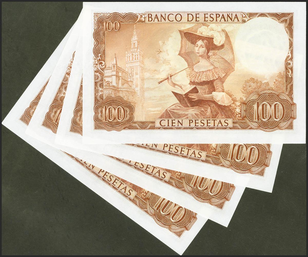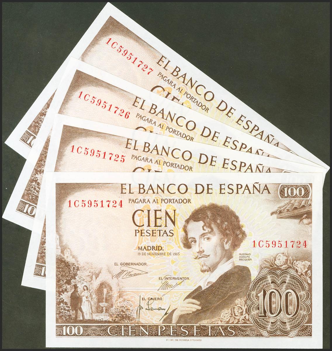 Conjunto de 4 billetes correlativos de 100 Pesetas, emitidos el 19 de Noviembre de 1965, todos ellos con la serie 1C. (Edifil 2021: 470a). SC.