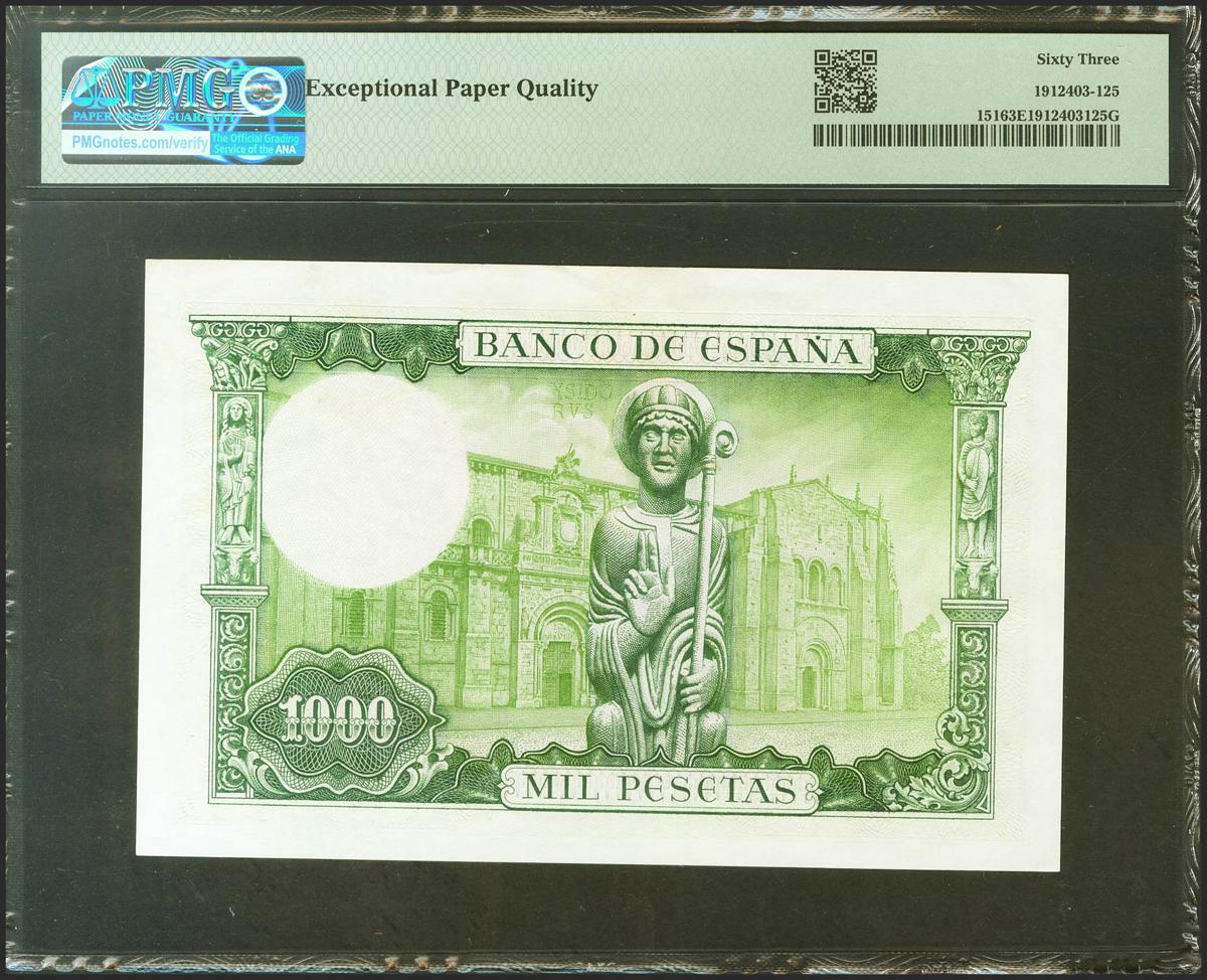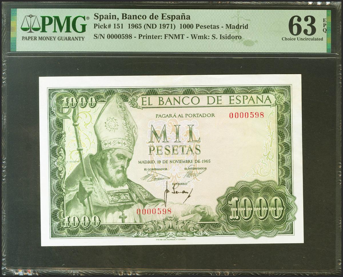 1000 Pesetas. 19 de Noviembre de 1965. Sin serie y numeración bajísima (0000598). (Edifil 2021: 471, Pick: 151). Inusual en esta calidad, apresto original. SC. Encapsulado PMG63EPQ.