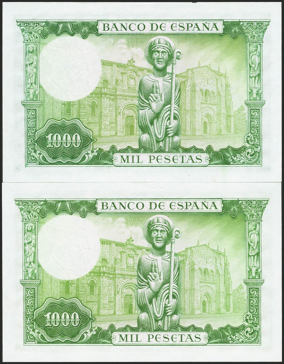 1000 Pesetas. 19 de Noviembre de 1965. Pareja correlativa. Serie J y con la curiosidad de las numeraciones estampadas con diferentes tonalidades (tintajes) de color. (Edifil 2021: 471b). Conservando todo su apresto original. SC.