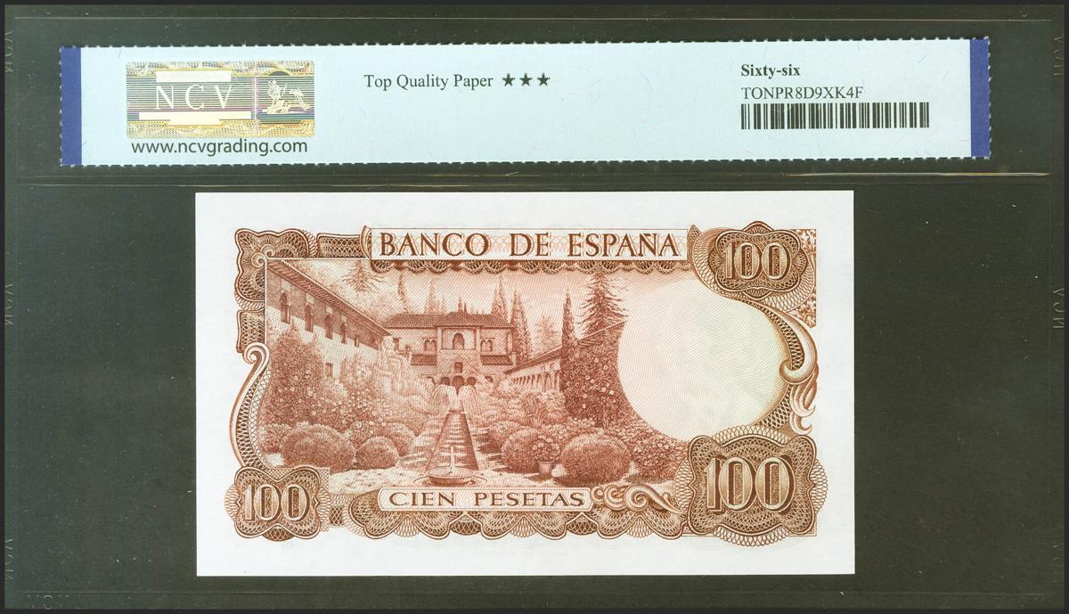 100 Pesetas. 17 de Noviembre de 1970. Serie especial 9A. (Edifil 2021: 472d, Pick: 152a*). Raro en esta excepcional calidad, apresto original. SC. Encapsulado NCV66TQP.