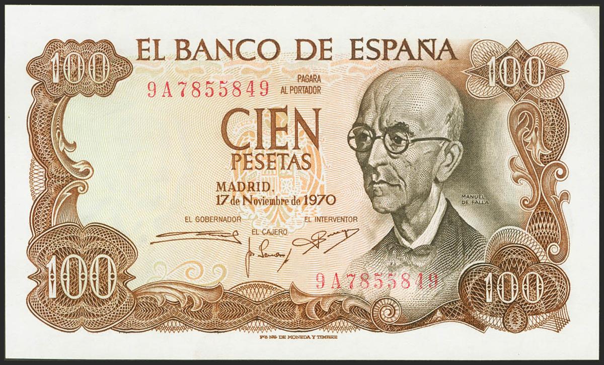 100 Pesetas. 17 de Noviembre de 1970. Serie especial 9A. (Edifil 2021: 472d). Apresto original. SC-.