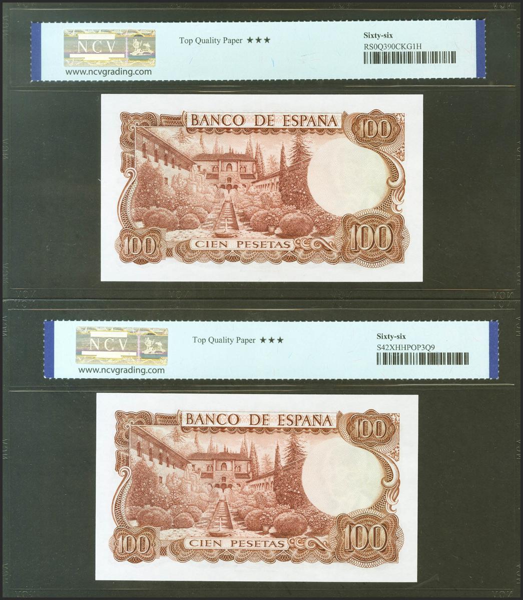 100 Pesetas. 17 de Noviembre de 1970. Pareja correlativa. Serie especial 9A. (Edifil 2021: 472d, Pick: 152a*). Rara en esta excepcional calidad, apresto original. SC. Encapsulados NCV66TQP, ambos.
