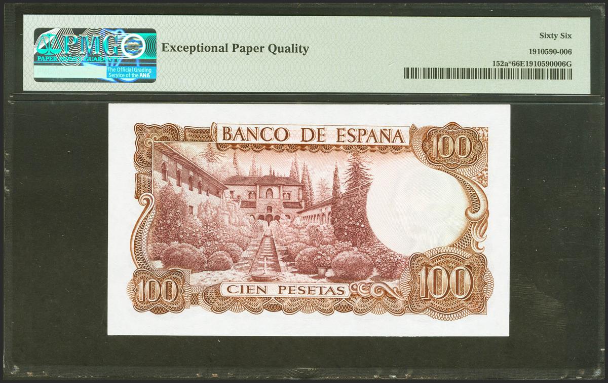 100 Pesetas. 17 de Noviembre de 1970. Serie especial 9B. (Edifil 2021: 472d, Pick: 152a*). Apresto original. SC. Encapsulado PMG66EPQ.
