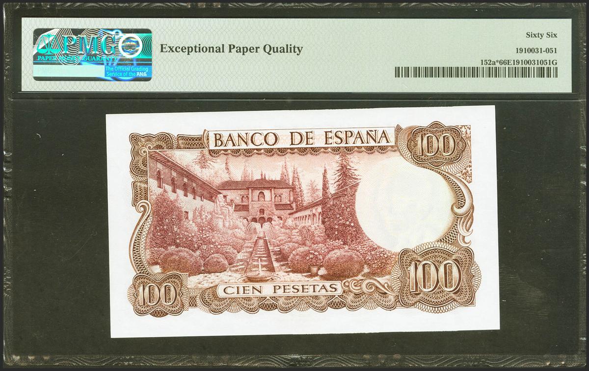 100 Pesetas. 17 de Noviembre de 1970. Serie especial 9C. (Edifil 2021: 472d, Pick: 152a*). Apresto original. SC. Encapsulado PMG66EPQ.