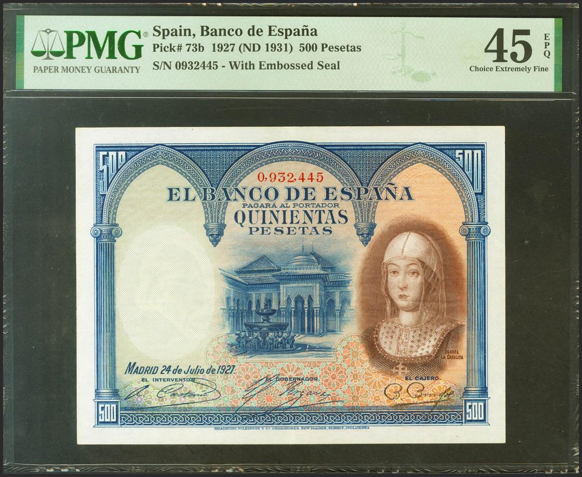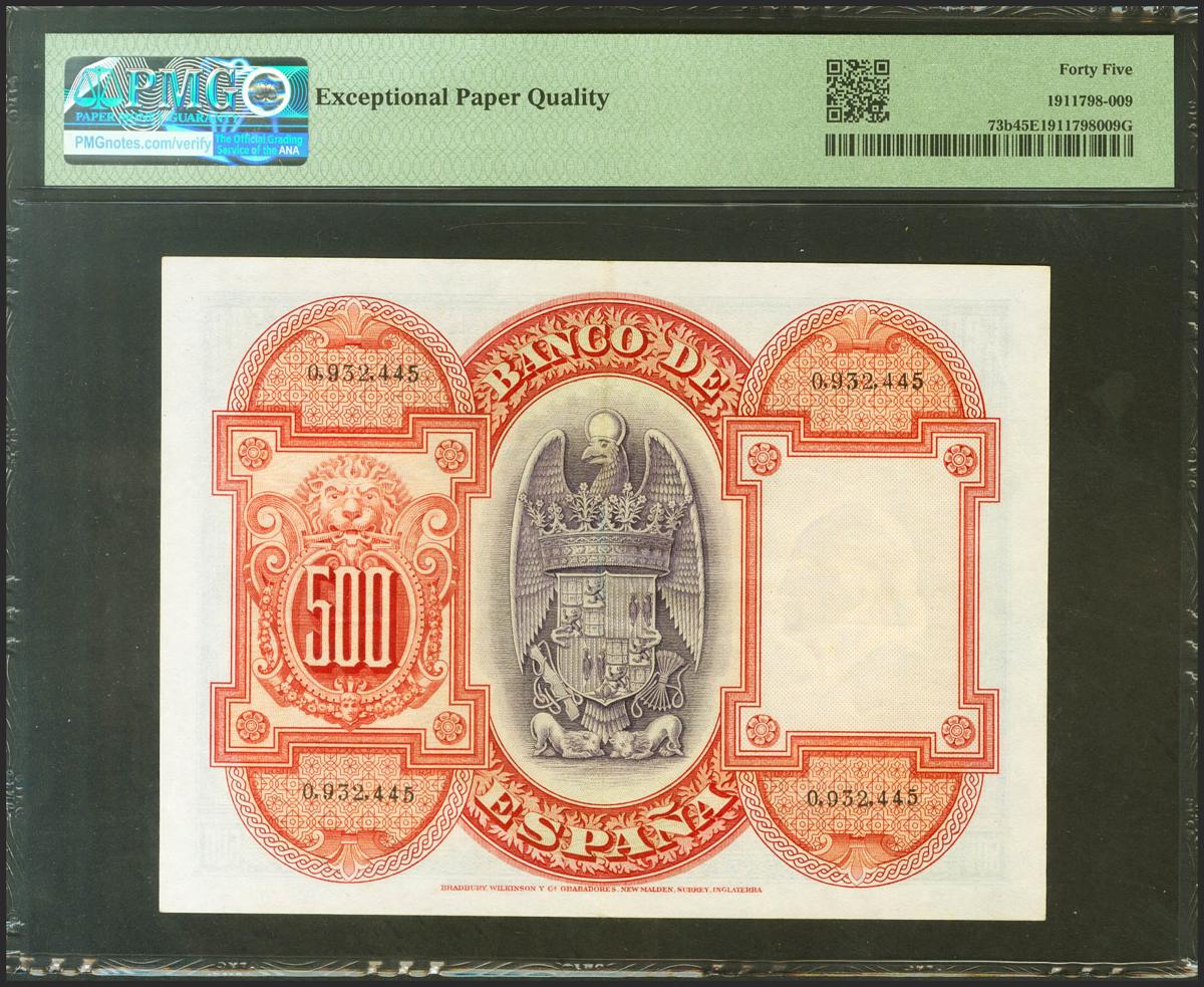 500 Pesetas. 24 de Julio de 1927. Sin serie, numeración anterior al 1602000 y con el sello GOBIERNO PROVISIONAL DE LA REPUBLICA / 14 ABRIL 1931. (Edifil 2021: 346, Pick: 73b). Apresto original. EBC-. Encapsulado PMG45EPQ.