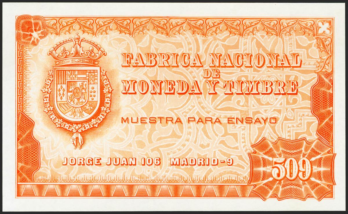 (1970ca). "Muestra para Ensayo", con el número 509, realizado en la FNMT, solamente el anverso y en color naranja. Muy raro. EBC+++.