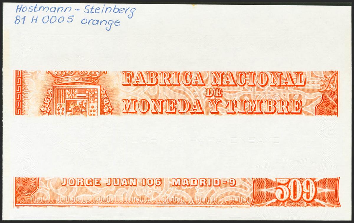 (1970ca). "Muestra para Ensayo", con el número 509, realizado en la FNMT y solamente el anverso y en color naranja parcialmente impreso, manuscrito en el margen superior "HOSTMANN-STEINBERG / 81 H 0005 ORANGE". Muy Raro. SC-.