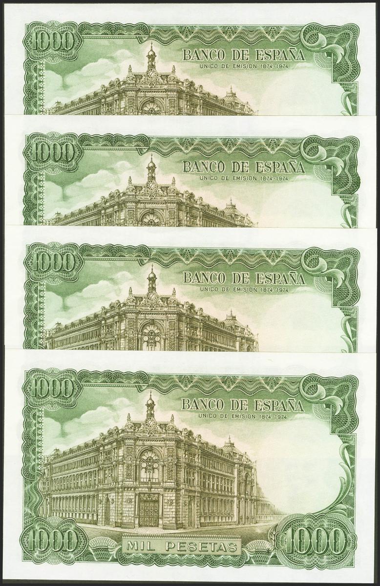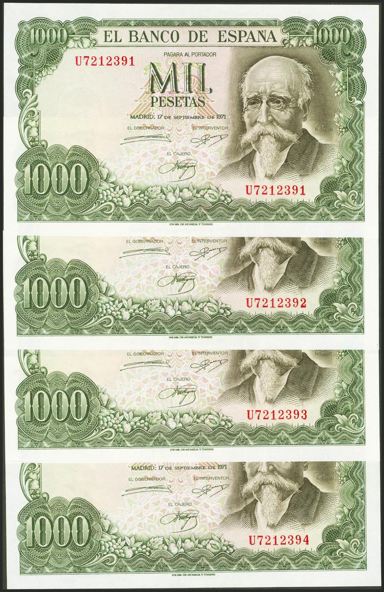 Conjunto de 4 billetes correlativos de 1000 Pesetas emitidos el 17 de Septiembre de 1971, todos ellos con la serie U (Edifil 2021: 474b) apresto original. SC-.