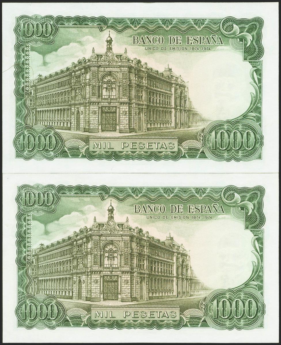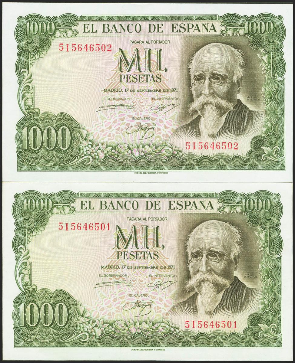 1000 Pesetas. 17 de Septiembre de 1971. Pareja correlativa. Serie 5I. (Edifil 2021: 474c). Conserva todo su apresto original. SC.
