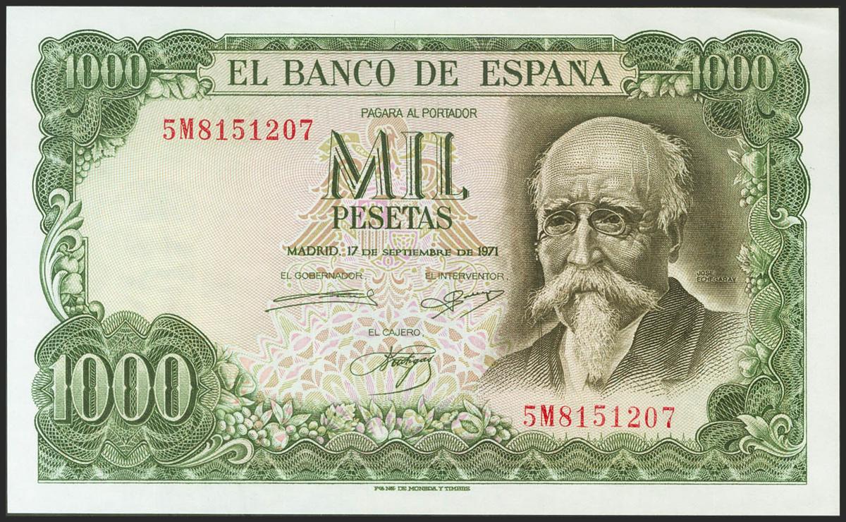 1000 Pesetas. 17 de Septiembre de 1971. Serie 5M. (Edifil 2021: 474c). Conserva todo su apresto original. SC.