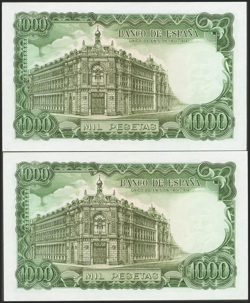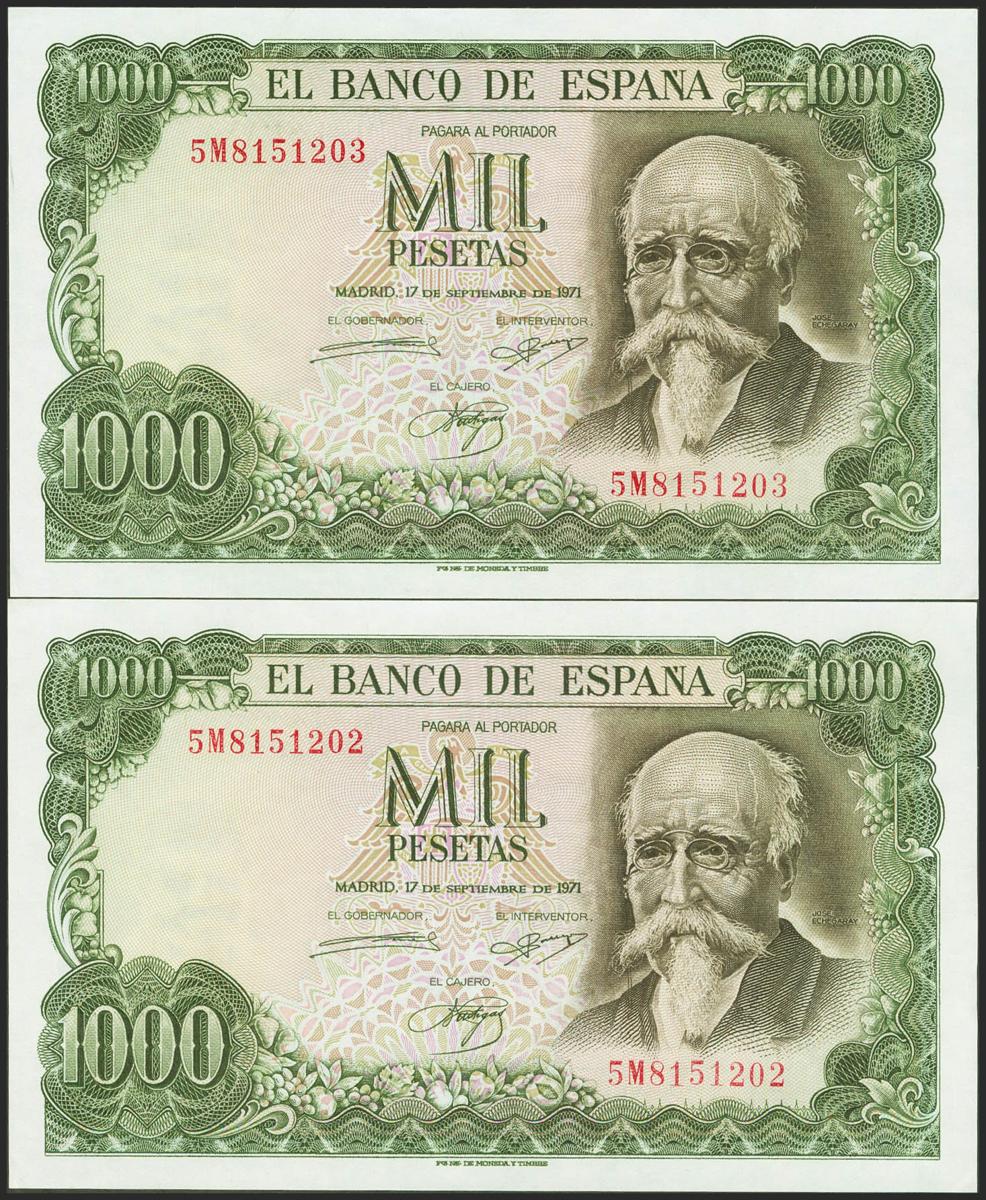 1000 Pesetas. 17 de Septiembre de 1971. Pareja correlativa. Serie 5M. (Edifil 2021: 474c). Conserva todo su apresto original. SC.