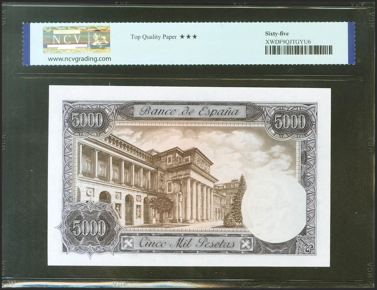 5000 Pesetas. 6 de Febrero de 1976. Serie especial 9A. (Edifil 2021: 475b, Pick: 155*). Rarísimo en esta excepcional calidad, apresto original. SC. Encapsulado NCV65TQP.