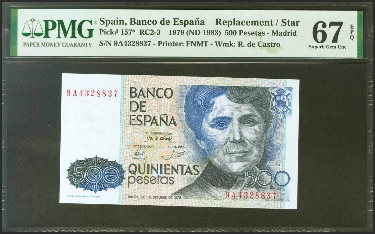 500 Pesetas. 23 de Octubre de 1979. Serie especial 9A. (Edifil 2021: 476b, Pick: 157*). Raro en esta excepcional calidad, apresto original. SC. Encapsulado PMG67EPQ.
