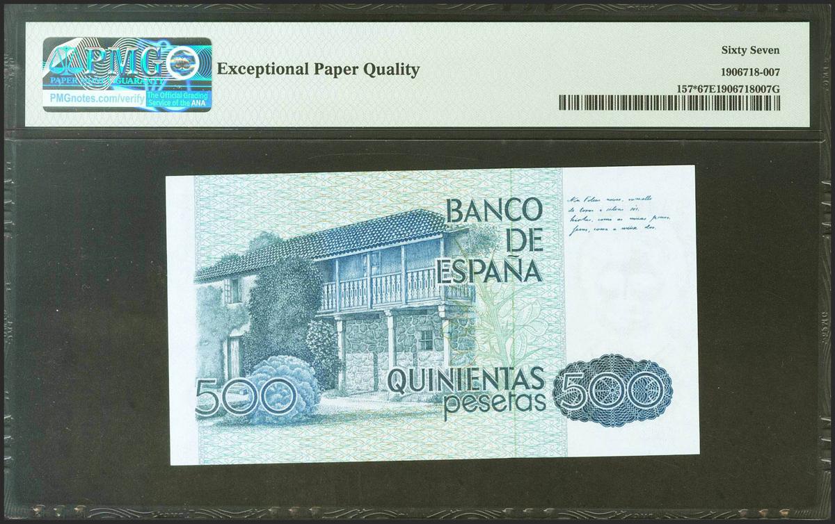500 Pesetas. 23 de Octubre de 1979. Serie especial 9A. (Edifil 2021: 476b, Pick: 157*). Raro en esta excepcional calidad, apresto original. SC. Encapsulado PMG67EPQ.