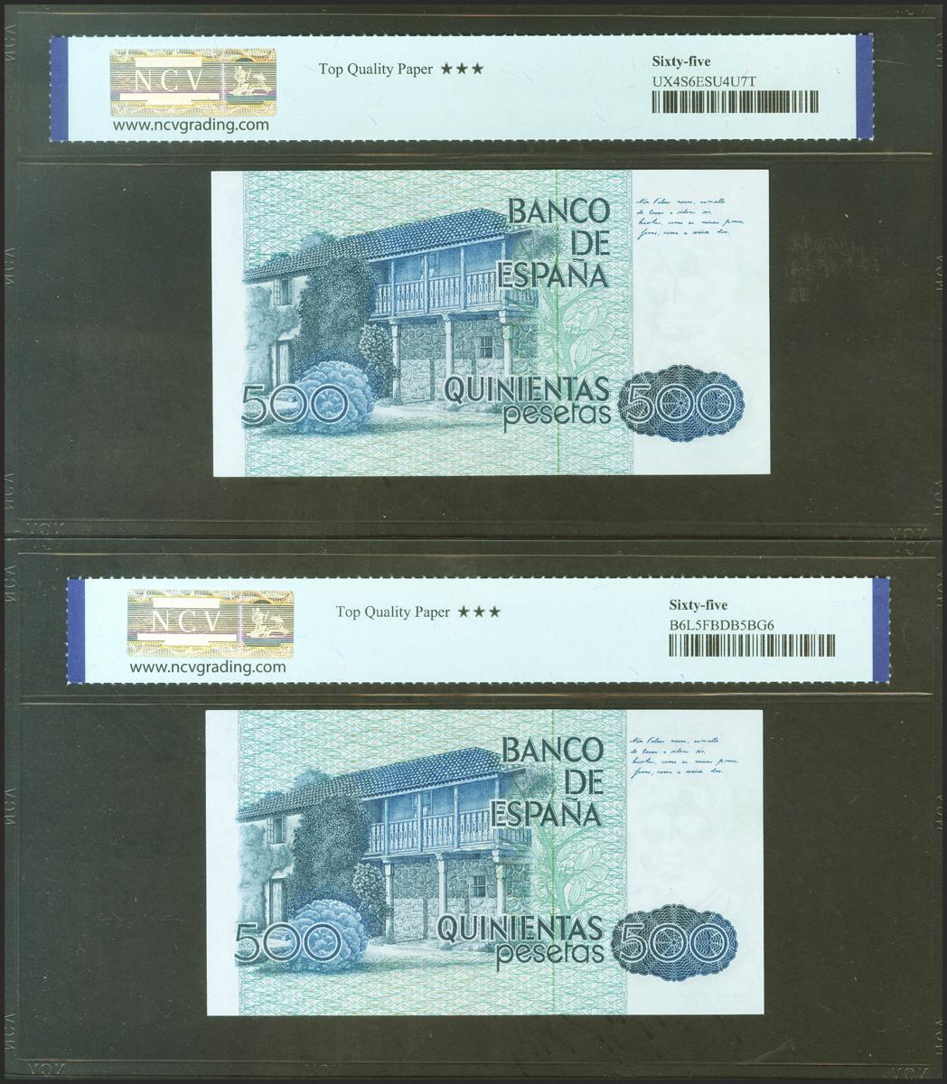 500 Pesetas. 23 de Octubre de 1979. Pareja correlativa. Sin serie y muy baja numeración. (Edifil 2021: 476). SC. Encapsulados NCV65TQP, ambos.