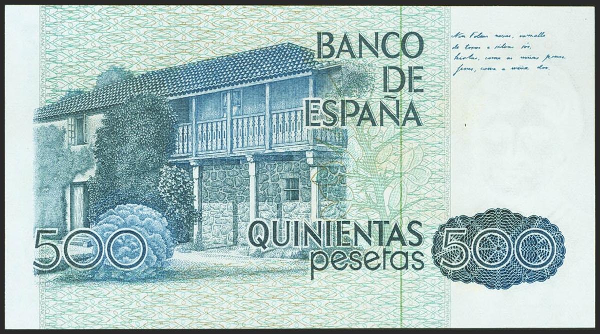 500 Pesetas. 23 de Octubre de 1979. Sin serie. (Edifil 2021: 476). Ondulación natural del proceso de fabricación (este es el único motivo de "quitarle" el SC). EBC+.