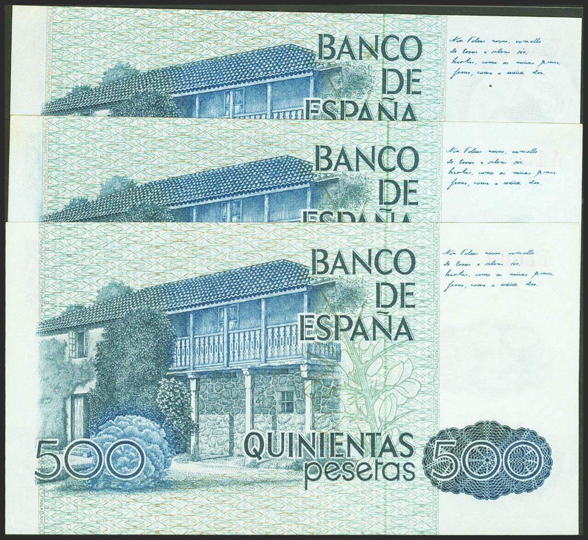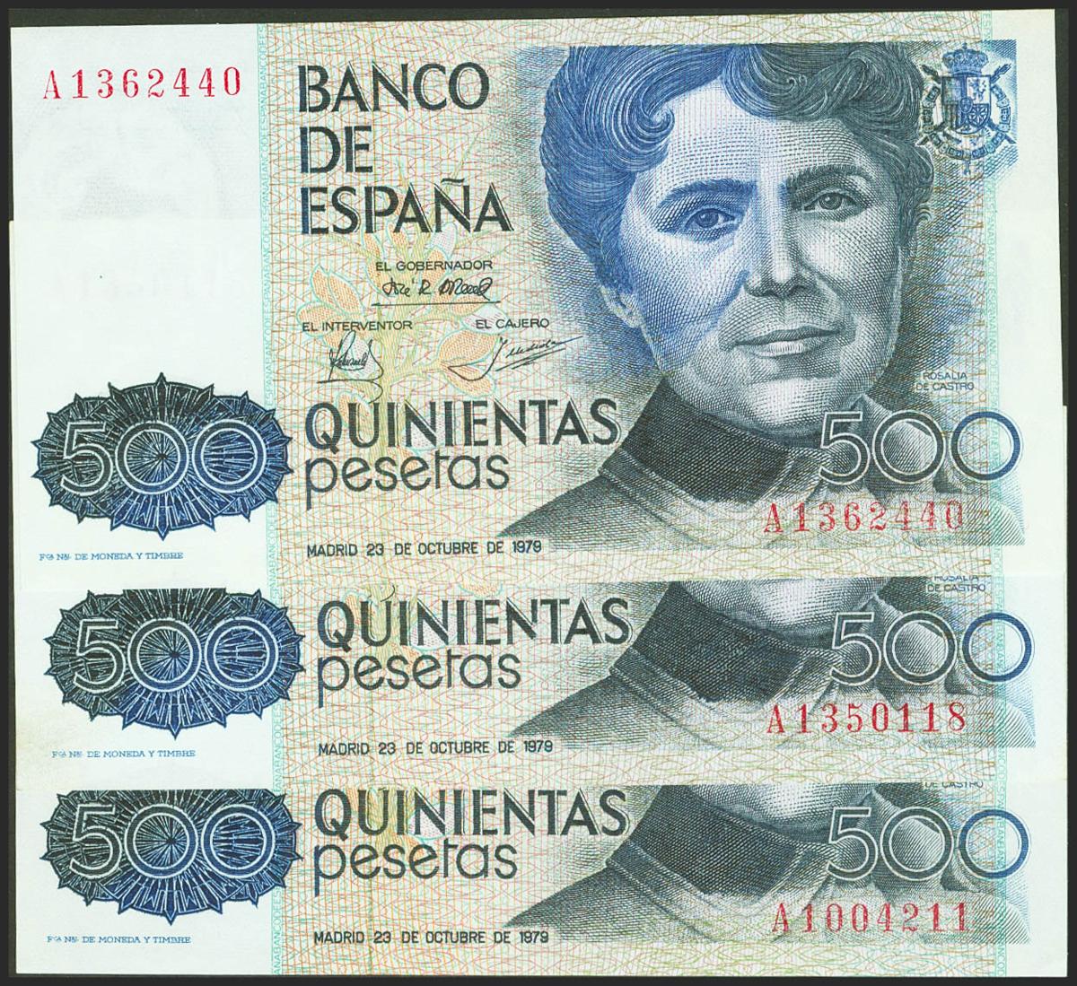 Conjunto de 3 billetes de 500 Pesetas emitidos el 23 de Octubre de 1979, todos ellos con la serie A. (Edifil 2021: 476a). SC/SC-.