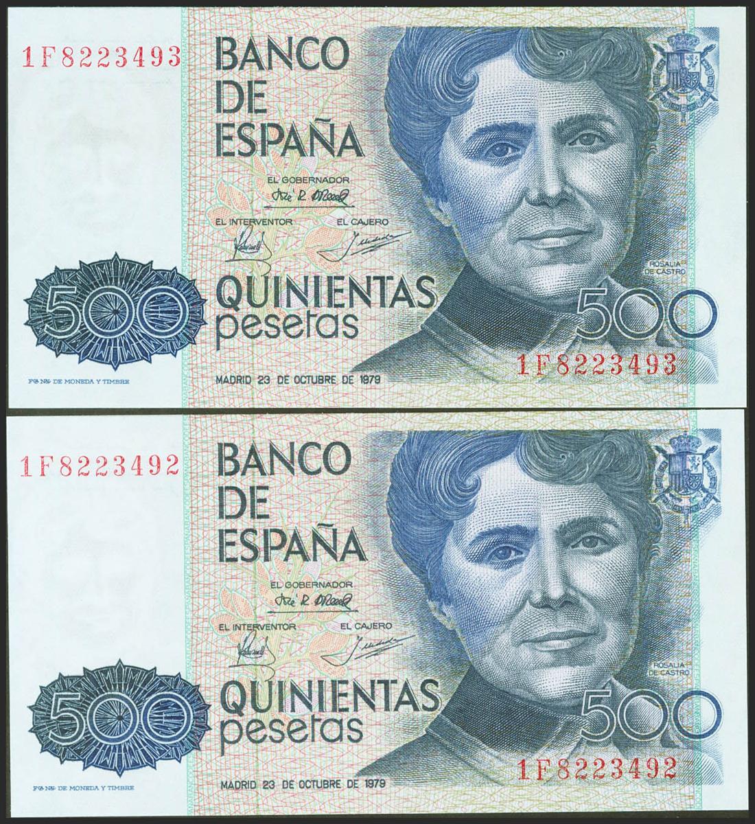 500 Pesetas. 23 de Octubre de 1979. Pareja correlativa. Serie 1F. (Edifil 2021: 476a). SC.