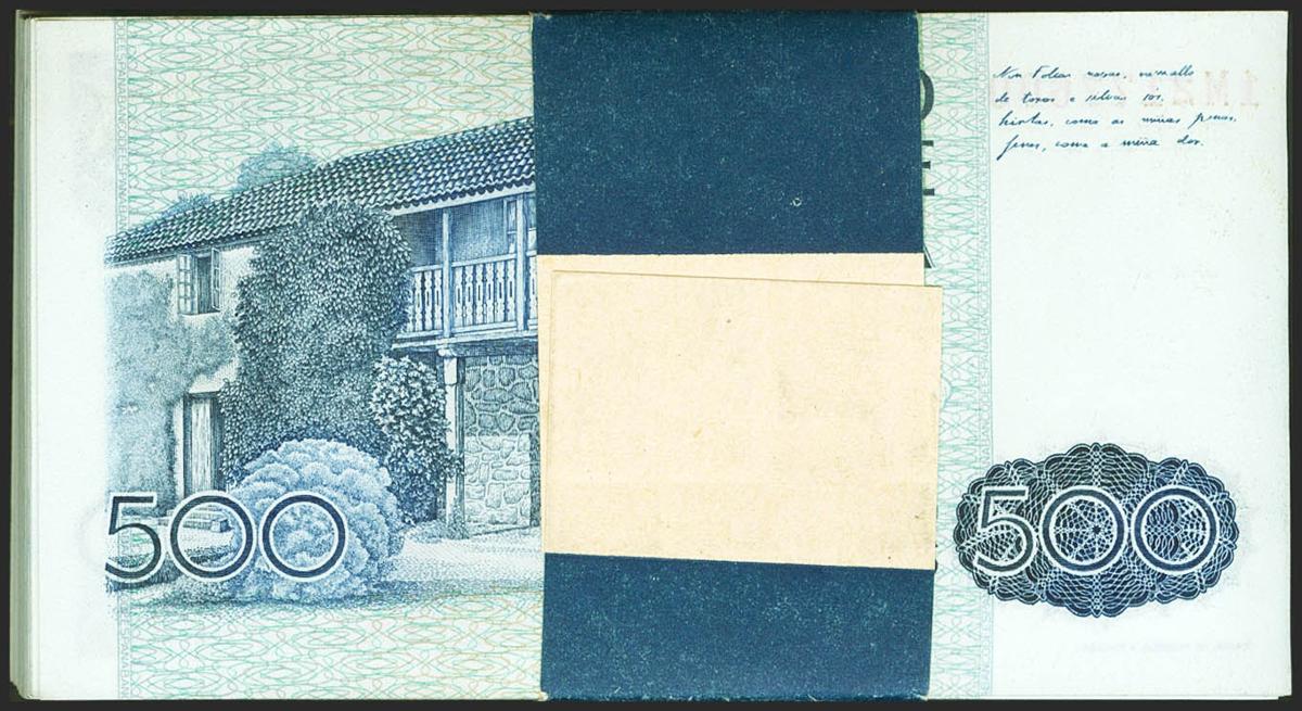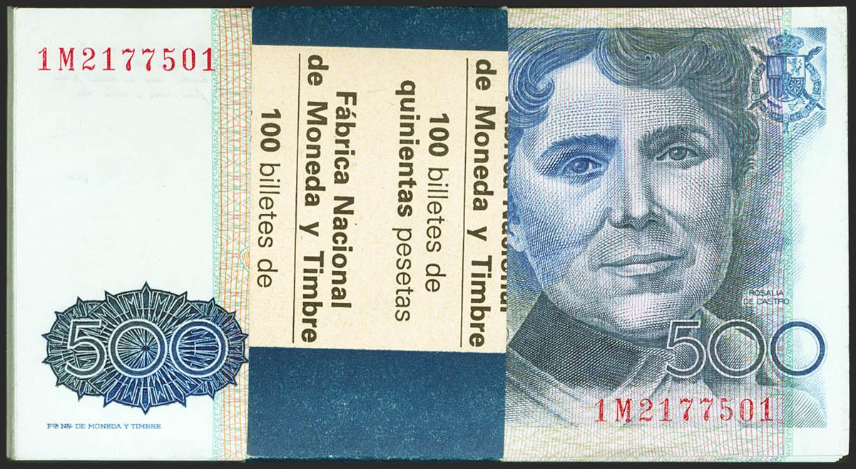 Conjunto de 100 billetes de 500 Pesetas emitidos el 23 de Octubre de 1979, en "fajo" y con su precinto original de la serie 1M. (Edifil 2017: 476a). SC.