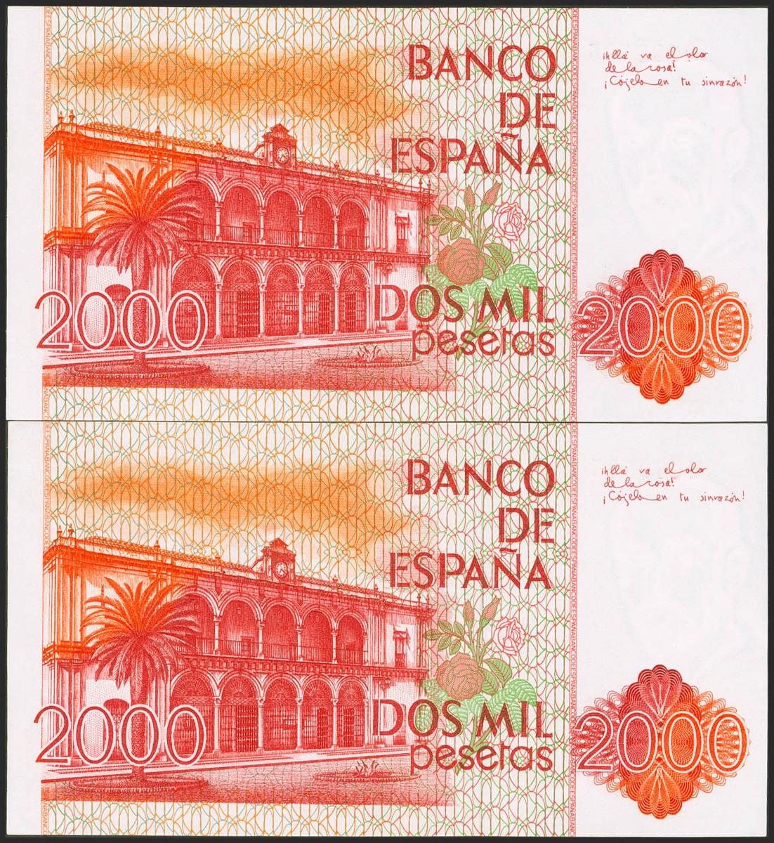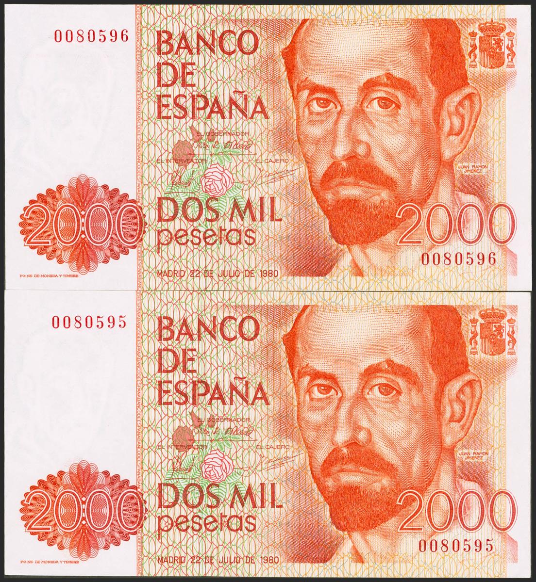 2000 Pesetas. 22 de Julio de 1980. Pareja correlativa. Sin serie y numeración baja. (Edifil 2021: 479). Presenta una ligera ondulación que no rompe fibra. EBC+++.