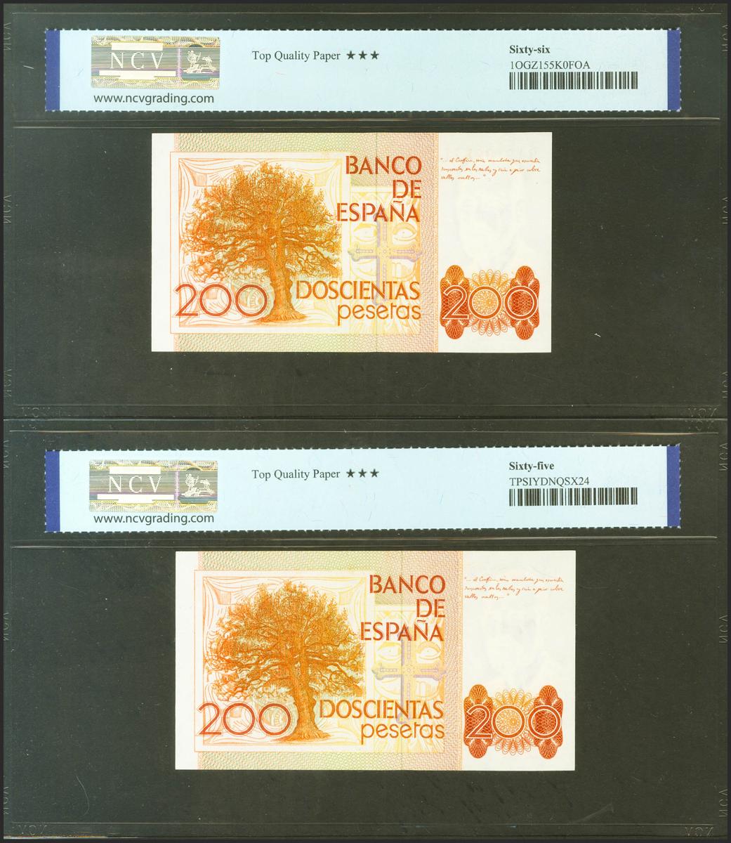 200 Pesetas. 16 de Septiembre de 1980. Pareja correlativa. Serie especial 9A. (Edifil 2021: 480b, Pick: 156*). Apresto original. SC. Encapsulados NCV65TQP/66TQP, ambos.