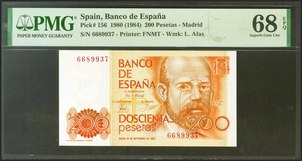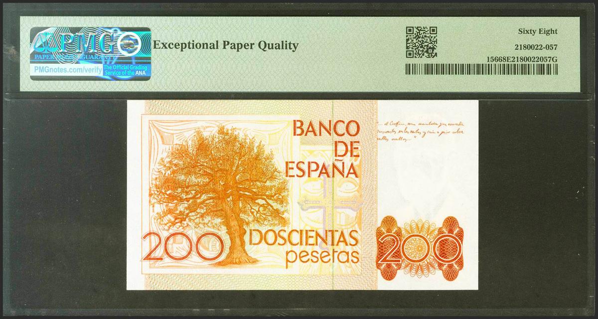 200 Pesetas. 16 de Septiembre de 1980. Sin serie. (Edifil 2021: 480, Pick: 156). Rarísimo, especialmente en esta excepcional calidad, apresto original. SC. Encapsulado PMG68EPQ.