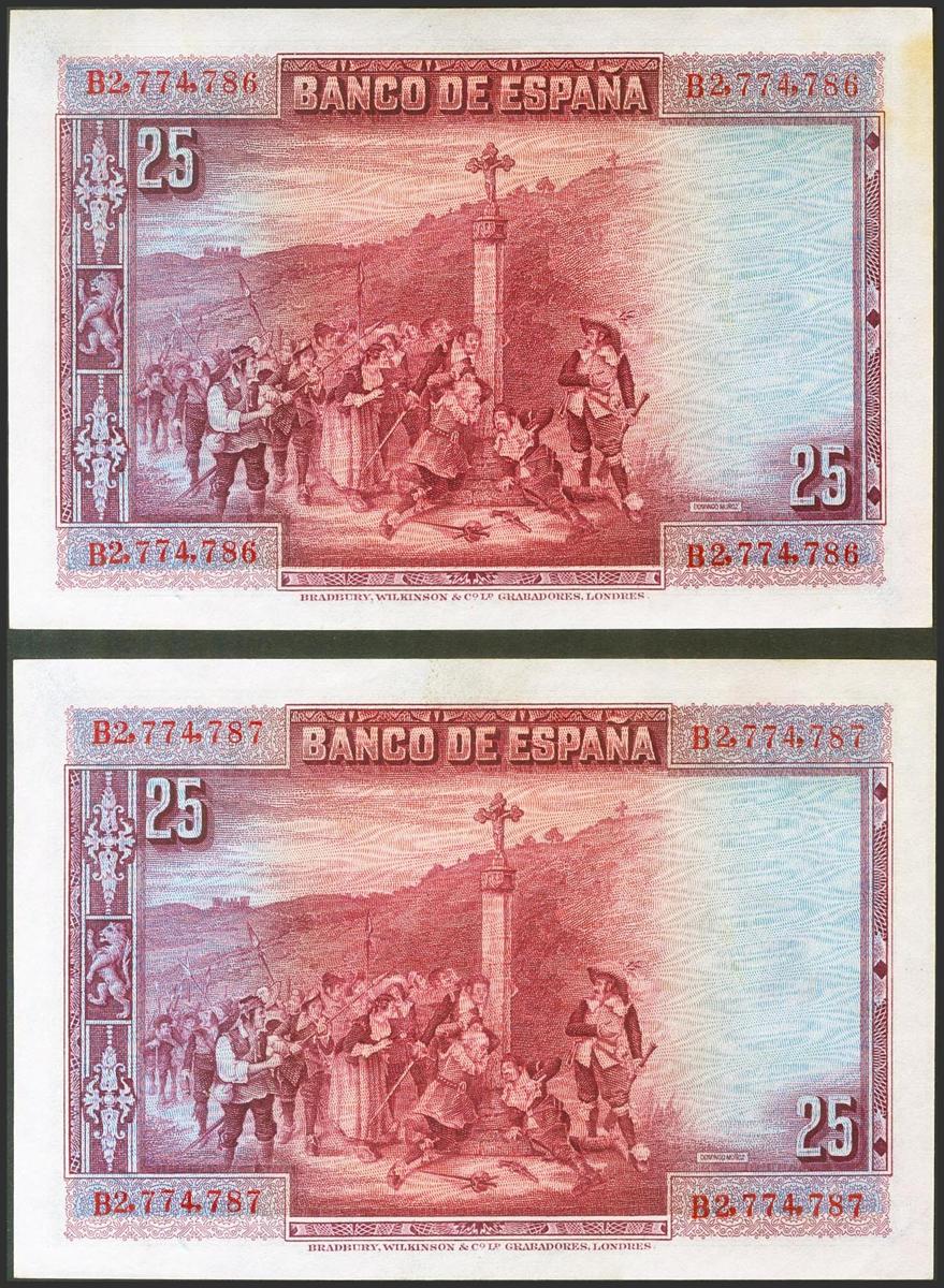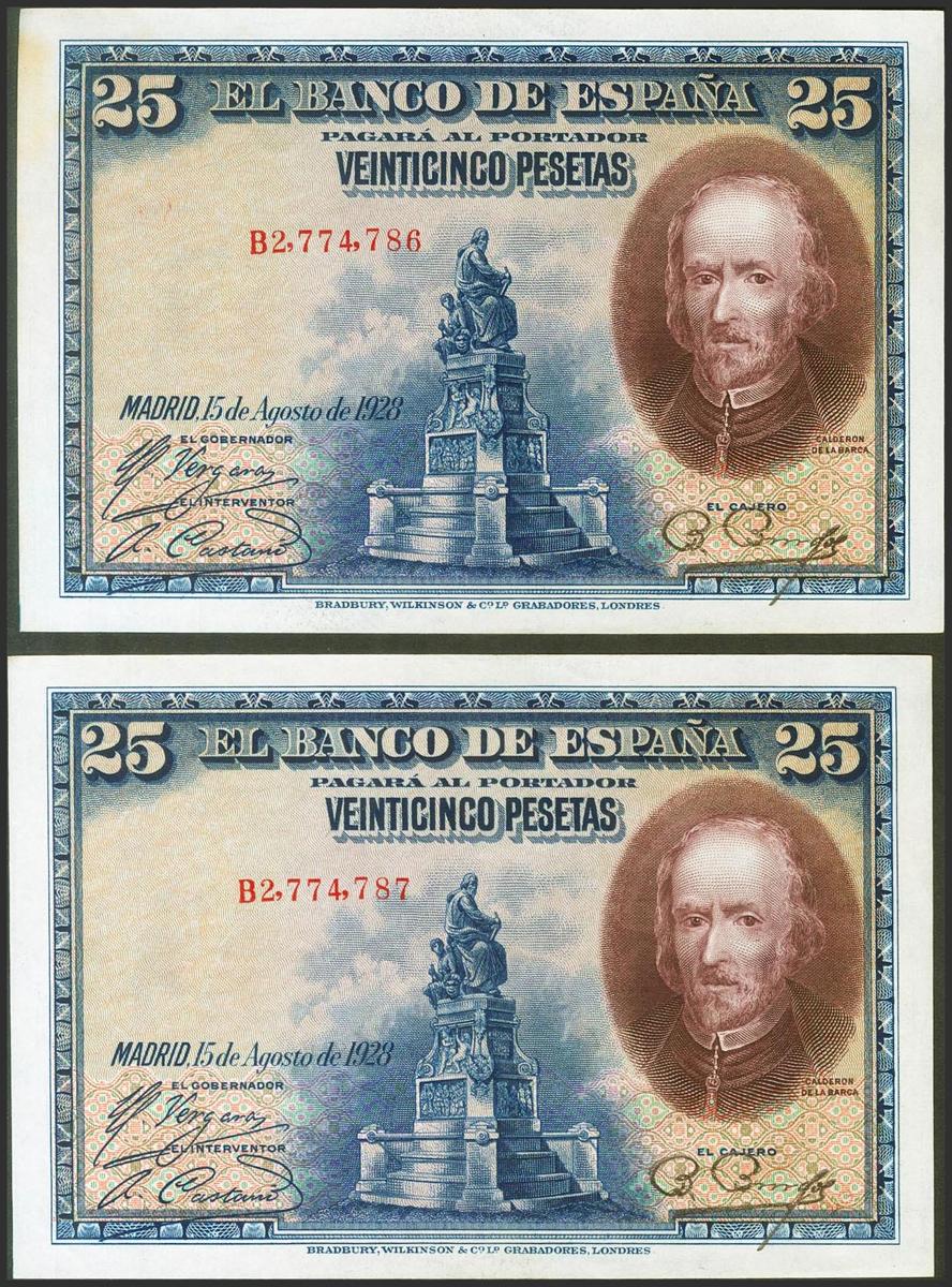 25 Pesetas. 15 de Agosto de 1928. Pareja correlativa. Serie B. (Edifil 2021: 353). Apresto original. SC-/SC--.