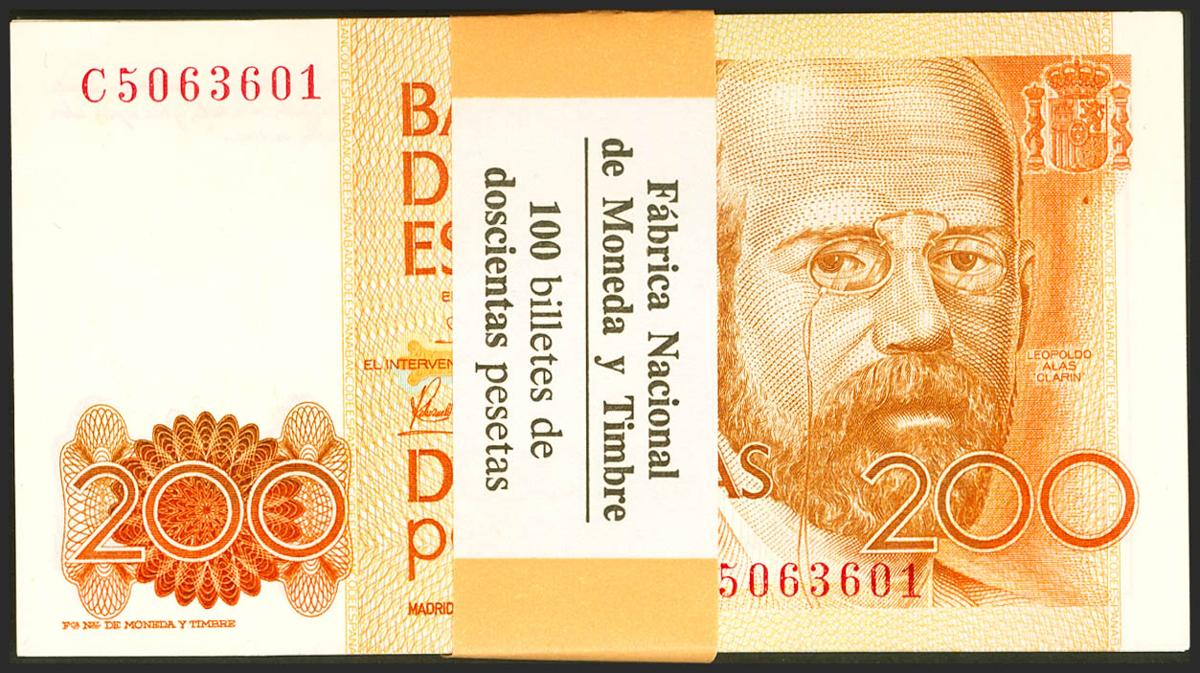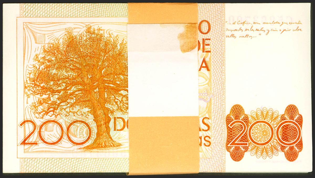 Conjunto de 100 billetes de 200 Pesetas emitidos el 16 de Setitiembre de 1980, en "fajo" y con su precinto original de la serie C. (Edifil 2017: 480a). SC.