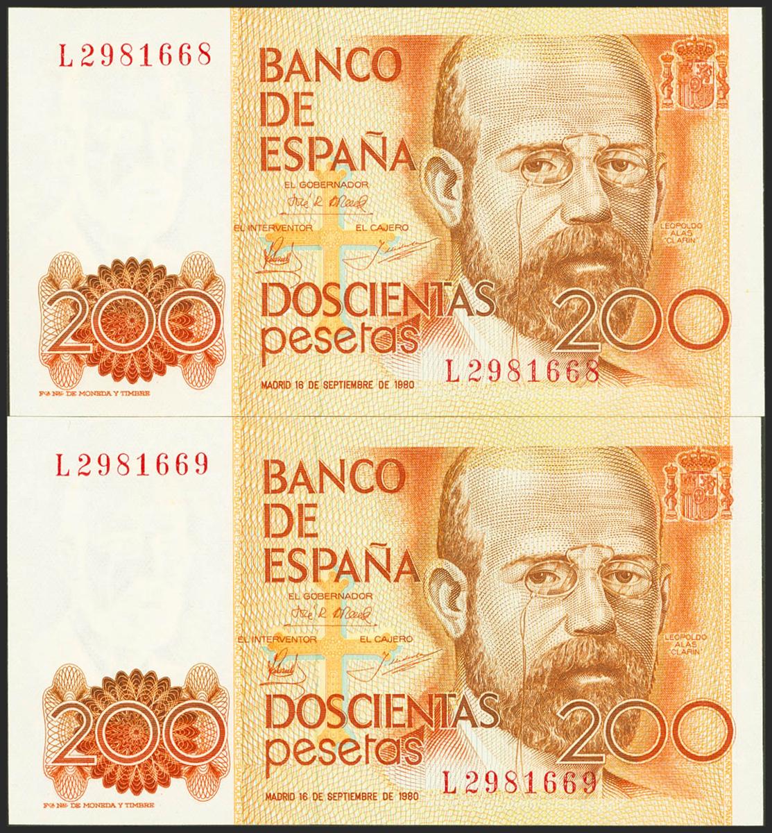 200 Pesetas. 16 de Septiembre de 1980. Pareja correlativa. Serie L. (Edifil 2021: 480a). Apresto original. SC.