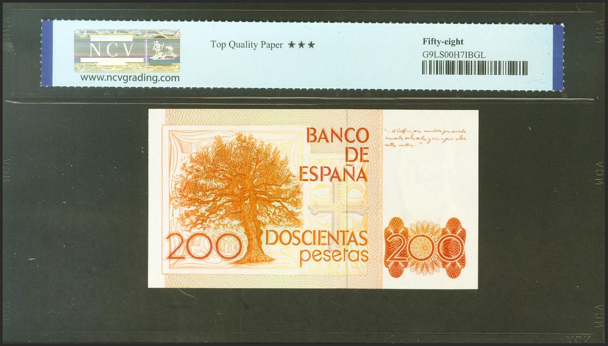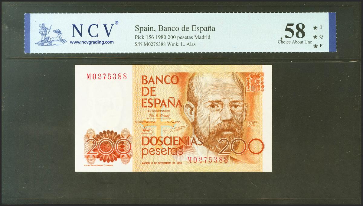 200 Pesetas. 16 de Septiembre de 1980. Serie M, última serie emitida. (Edifil 2021: 480a, Pick: 156). EBC+++. Encapsulado NCV58TQP.