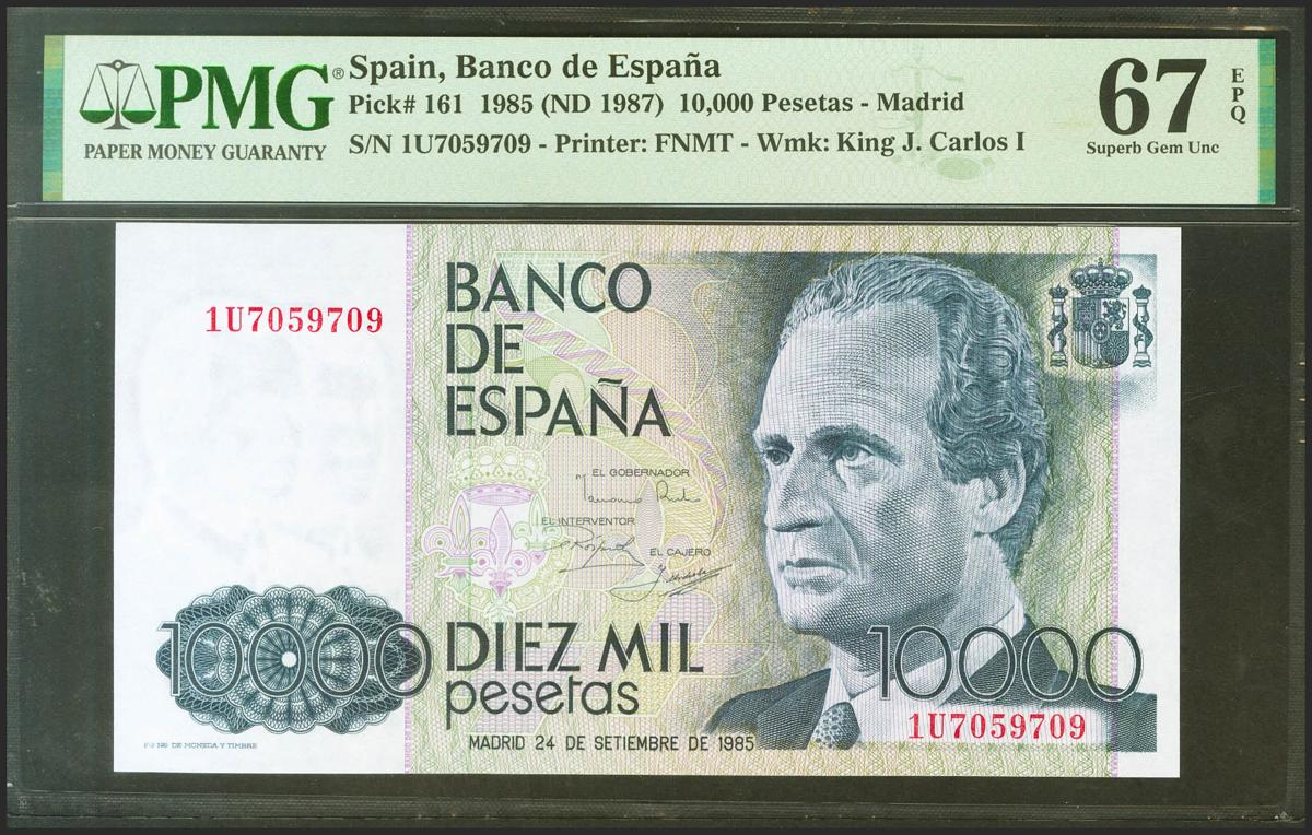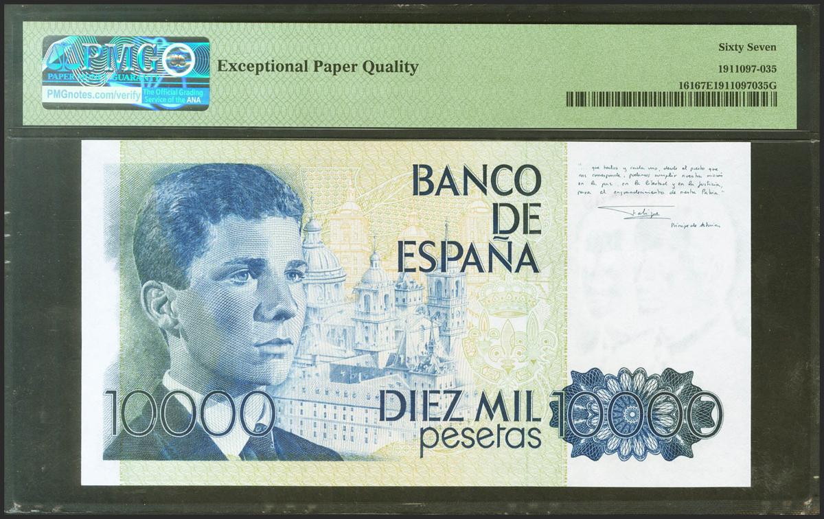 10000 Pesetas. 24 de Septiembre de 1985. Serie 1U. (Edifil 2021: 481a, Pick: 161). Raro en esta excepcional calidad, apresto original. SC. Encapsulado PMG67EPQ.