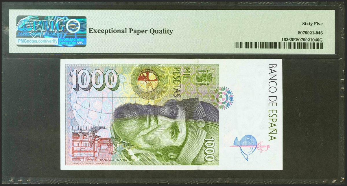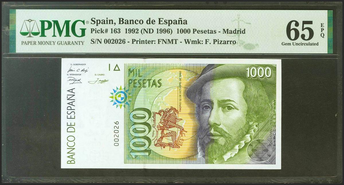 1000 Pesetas. 12 de Octubre de 1992. Sin serie y numeración bajísima. (Edifil 2021: 483, Pick: 163). Apresto original. SC. Encapsulado PMG65EPQ.