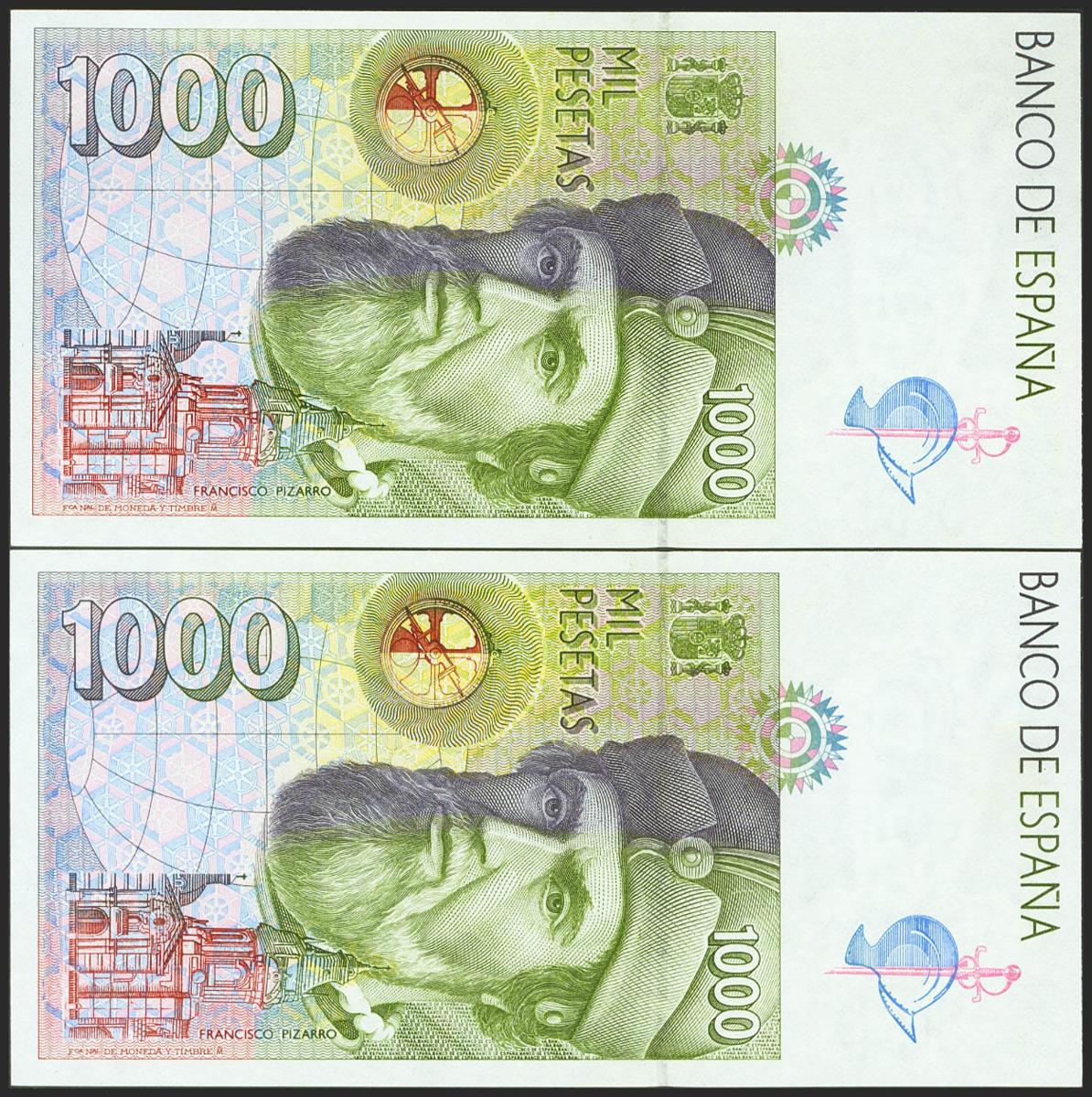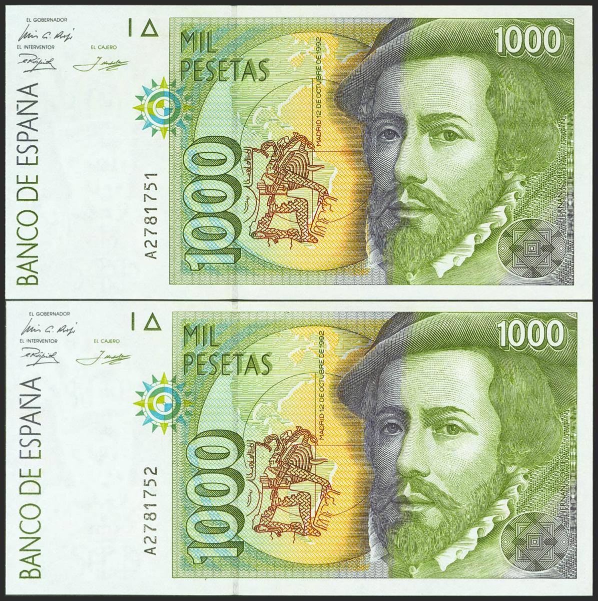 1000 Pesetas. 12 de Octubre de 1992. Pareja correlativa. Serie A. (Edifil 2021: 483a). SC.