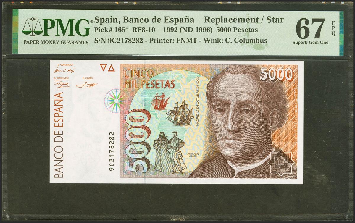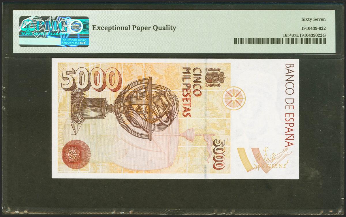 5000 Pesetas. 12 de Octubre de 1992. Serie especial 9C. (Edifil 2021: 484b, Pick: 165*). Inusual en esta excepcional calidad. SC. Encapsulado PMG67EPQ.