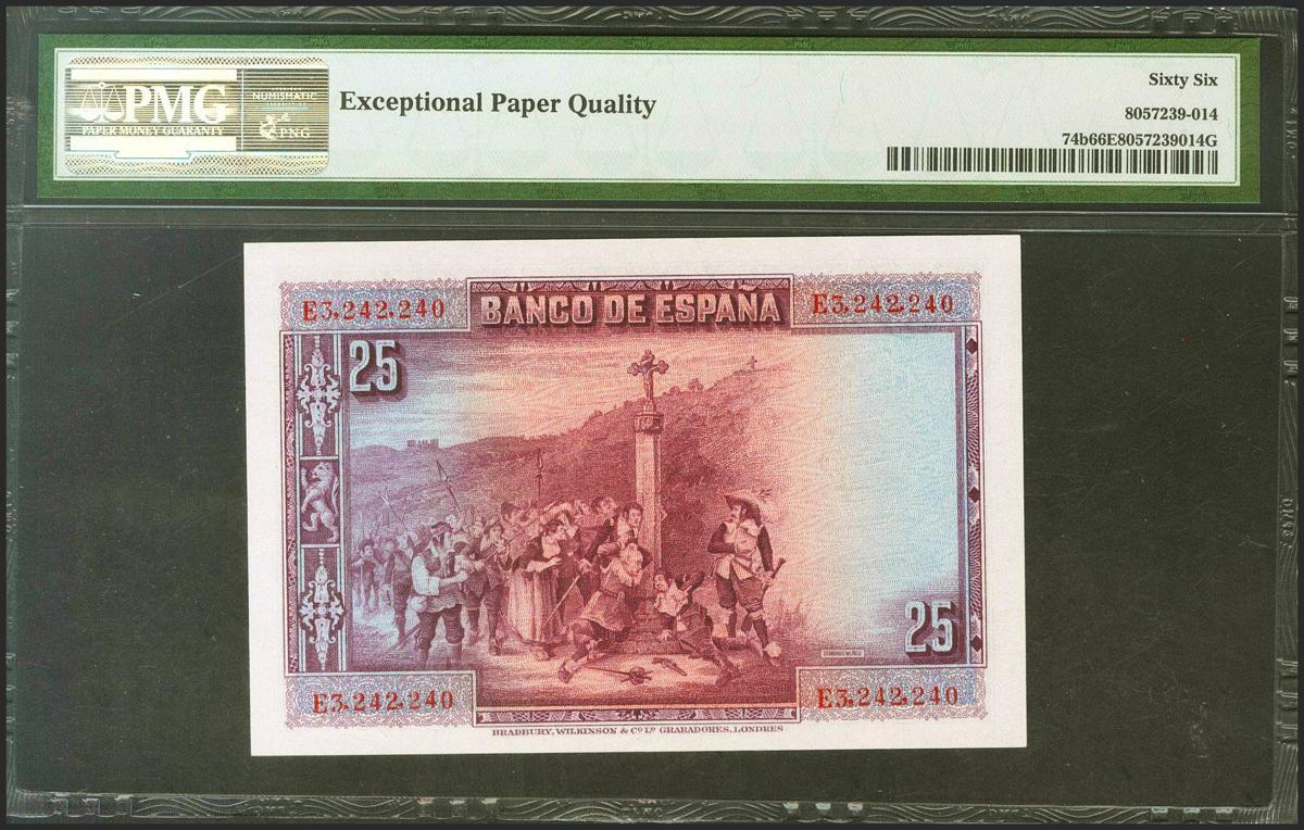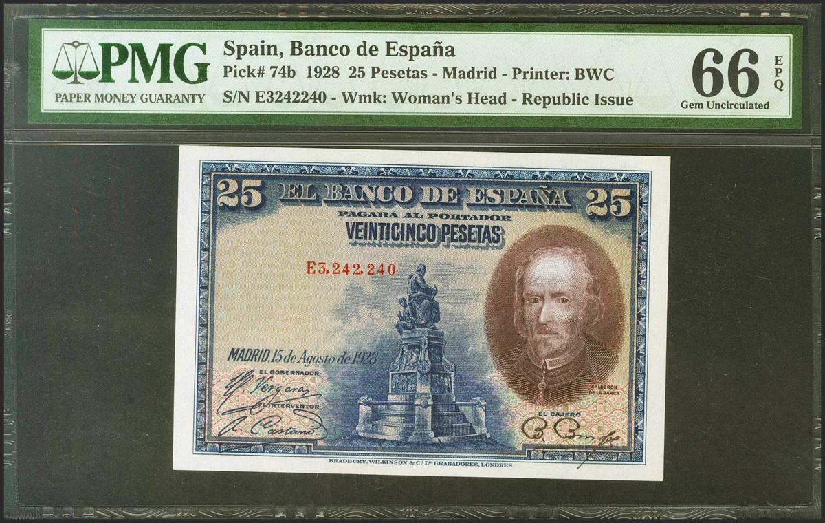25 Pesetas. 15 de Agosto de 1928. Serie E. (Edifil 2021: 353, Pick: 74b). Raro en esta excepcional calidad, apresto original. SC. Encapsulado PMG66EPQ.