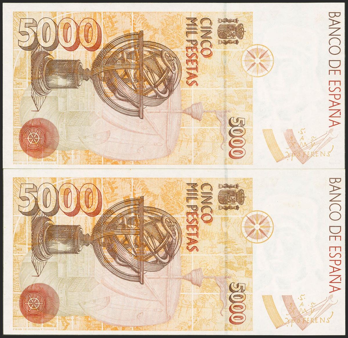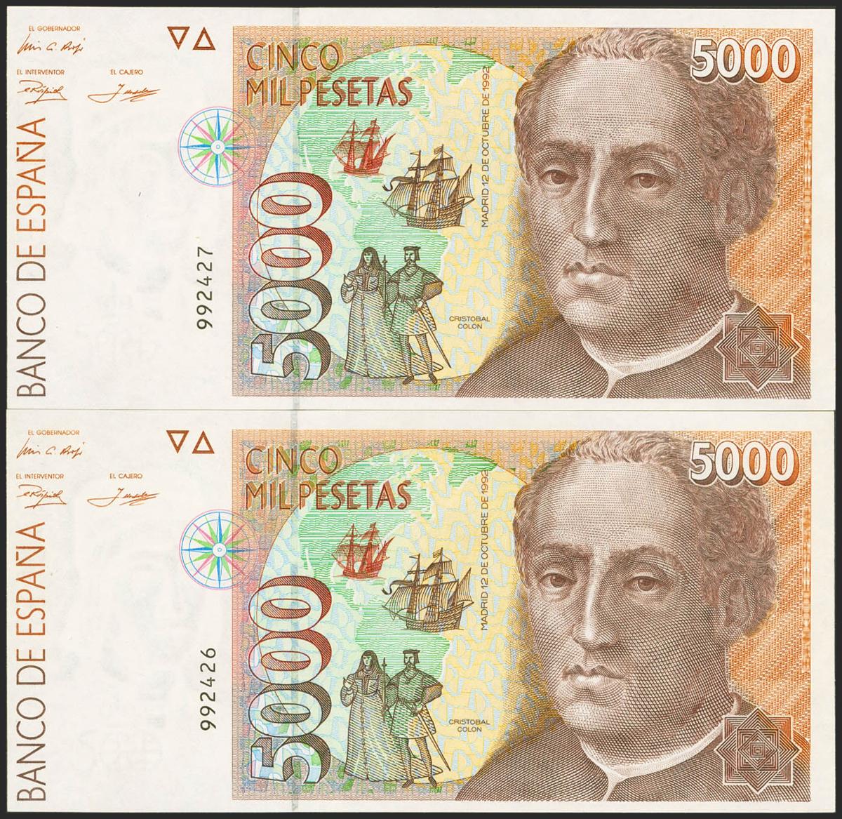 5000 Pesetas. 12 de Octubre de 1992. Pareja correlativa. Sin serie. (Edifil 2021: 484). SC.