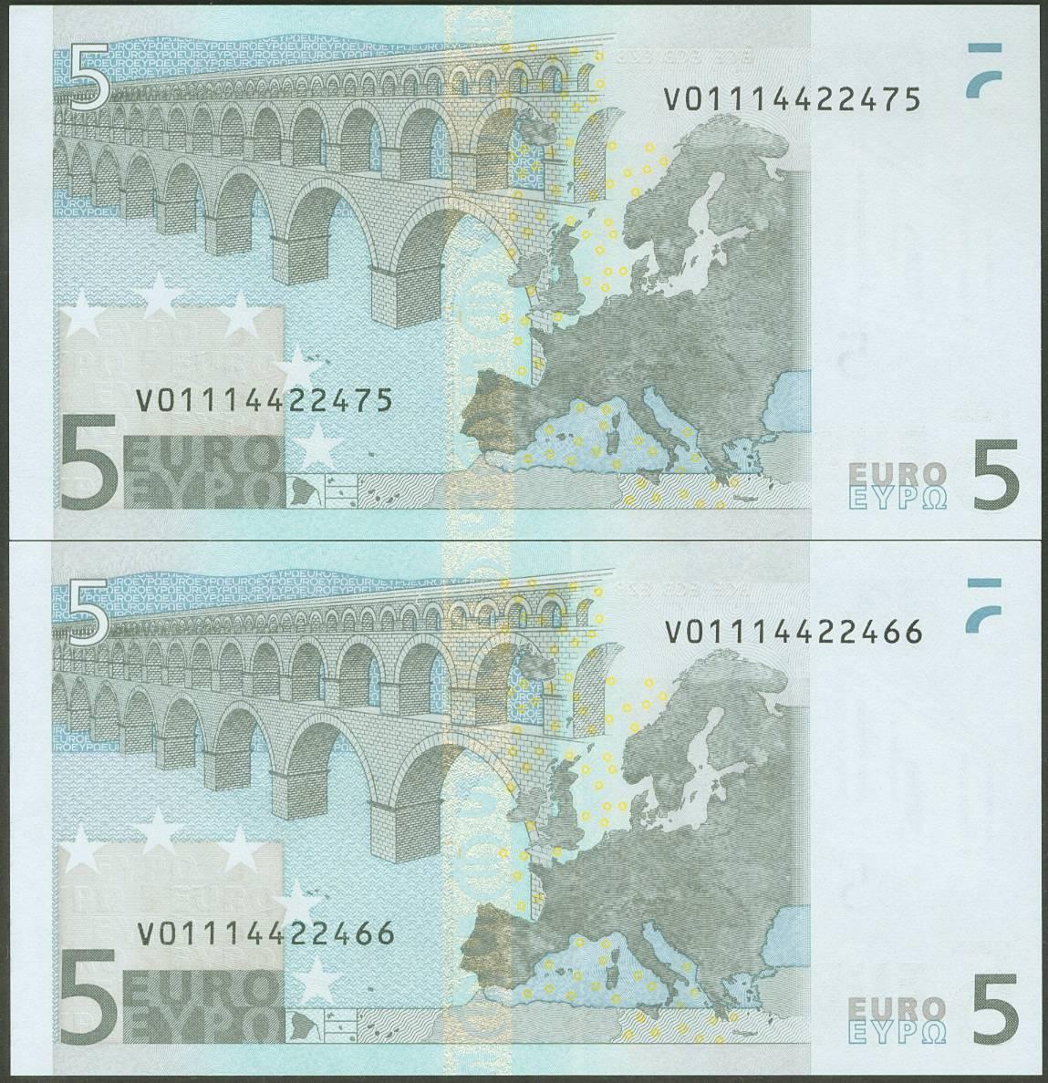 5 Euros. 1 de Enero de 2002. Pareja correlativa (cabe recordar que el último dígito de la numeración de todos los billetes denominados en euros es para control interno del Banco Central Europeo, el que marca la correlatividad de los billetes es el penúltimo dígito). Firma Duisenberg. Serie V (España). (Edifil 2021: 486). SC.
