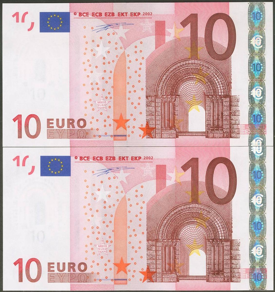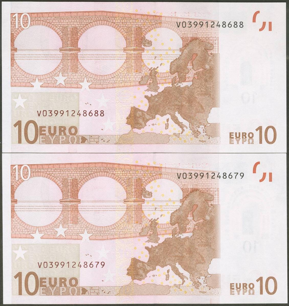 10 Euros. 1 de Enero de 2002. Pareja correlativa (cabe recordar que el último dígito de la numeración de todos los billetes denominados en euros es para control interno del Banco Central Europeo, el que marca la correlatividad de los billetes es el penúltimo dígito). Firma Duisenberg. Serie V (España). (Edifil 2021: 487). SC.