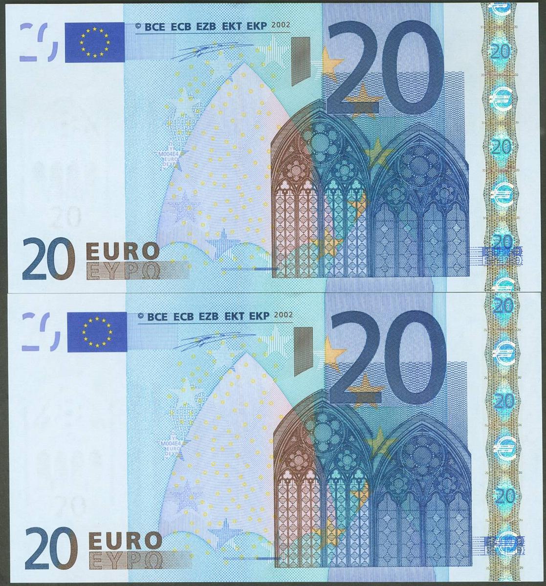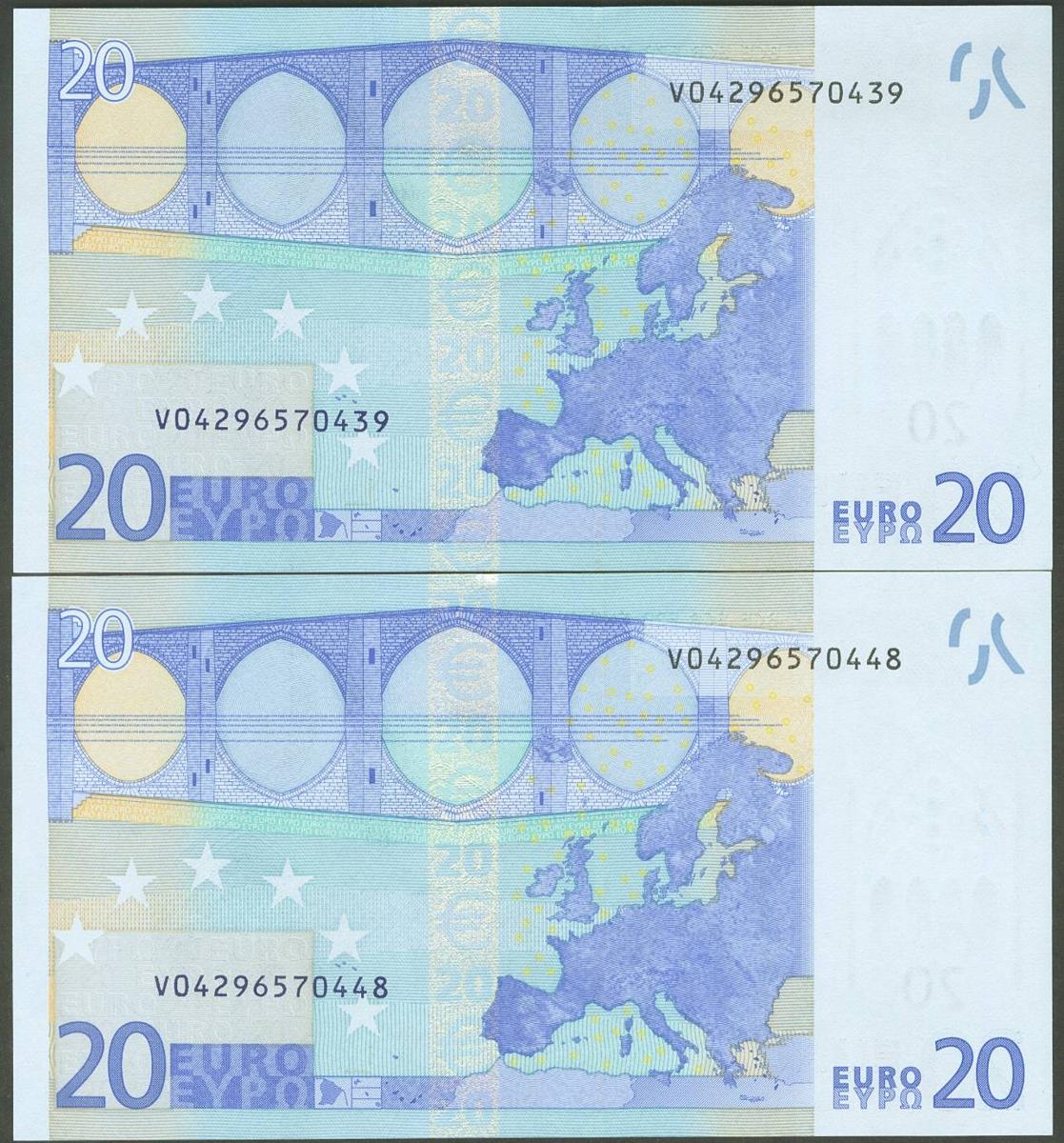 20 Euros. 1 de Enero de 2002. Pareja correlativa (cabe recordar que el último dígito de todos los billetes denominados en euros es para control interno del Banco Central Europeo, el que marca la correlatividad de los billetes es el penúltimo dígito). Firma Duisenberg. Serie V (España). (Edifil 2021: 488). SC