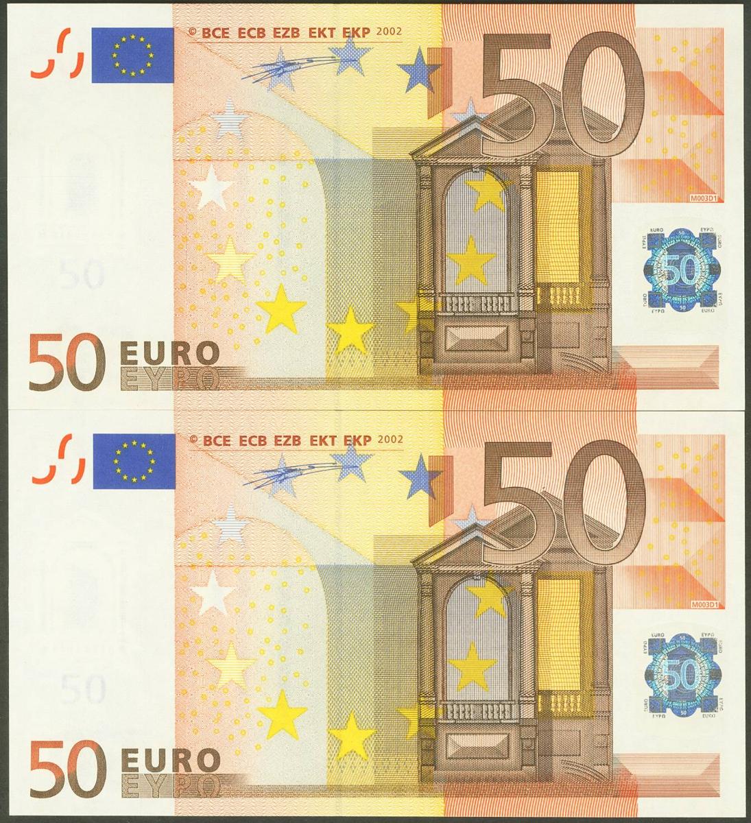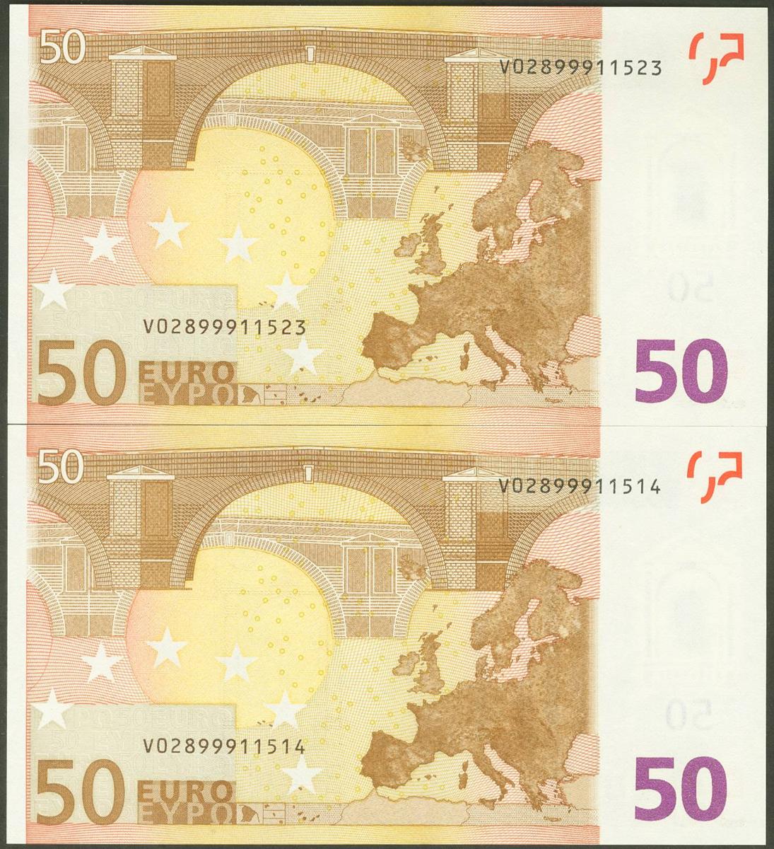 50 Euros. 1 de Enero de 2002. Pareja correlativa (cabe recordar que el último dígito de la numeración de todos los billetes denominados en euros es para control interno del Banco Central Europeo, el que marca la correlatividad de los billetes es el penúltimo dígito). Firma Duisenberg. Serie V (España). (Edifil 2021: 489). SC.
