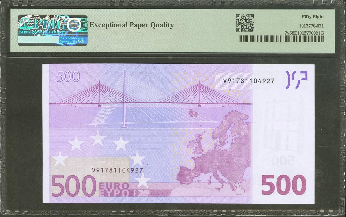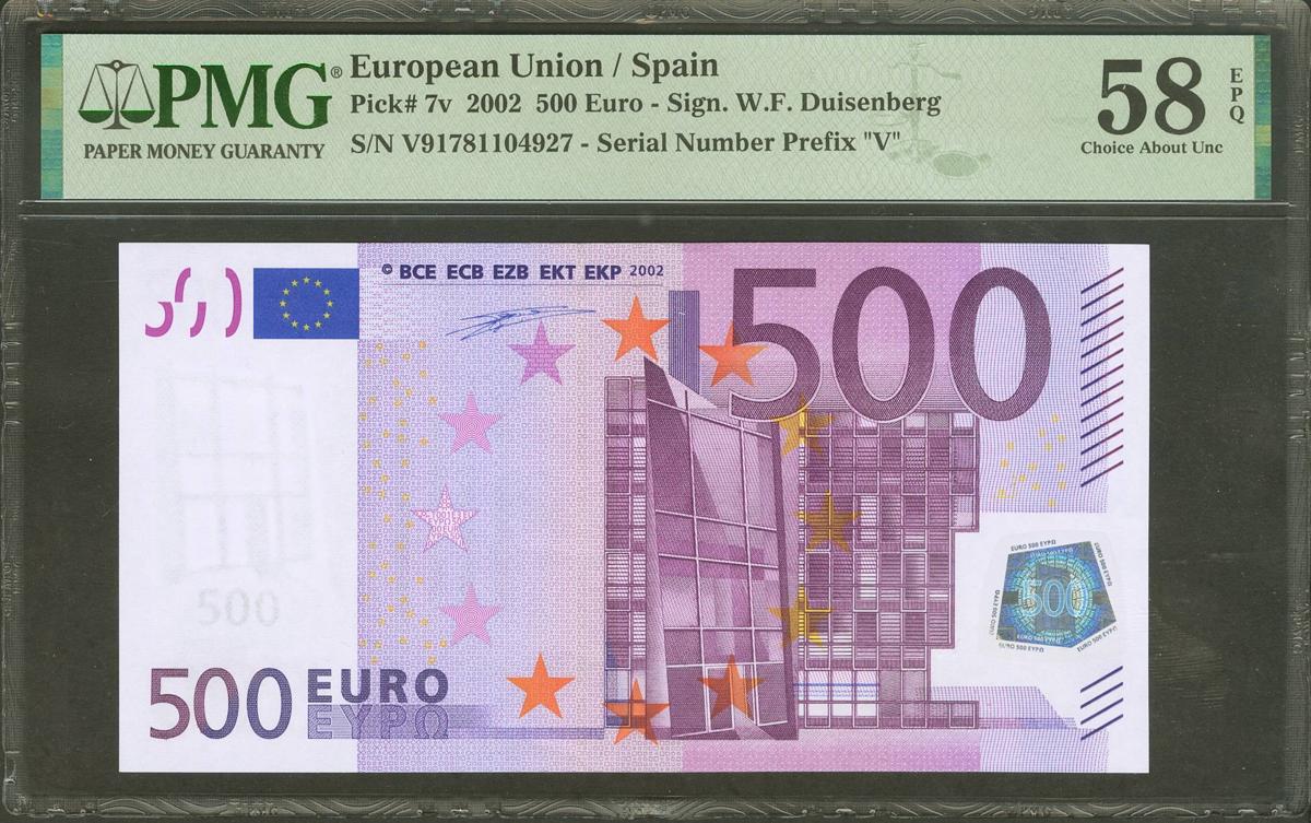 500 Euros. 1 de Enero de 2002. Firma Duisenberg. Serie V (España). (Edifil 2021: 492, Pick: 7v). EBC+++. Encapsulado PMG58EPQ.