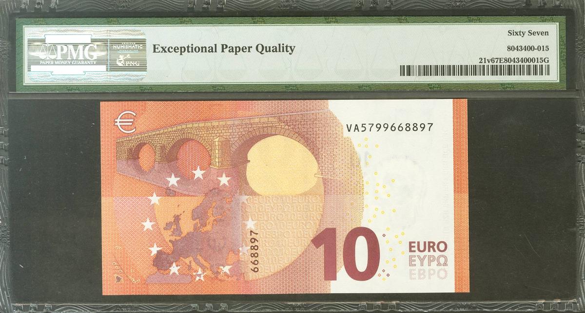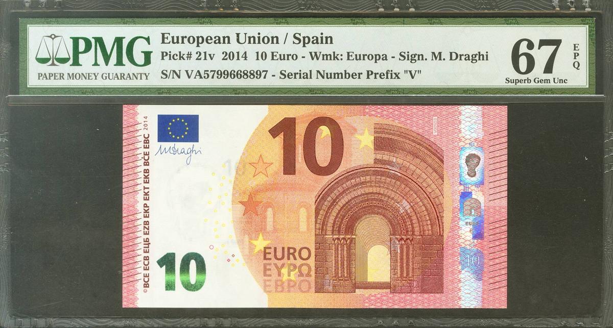 10 Euros. 23 de Septiembre de 2014. Firma Draghi. Serie V (España). (Edifil 2021: 494, Pick: 28v). SC. Encapsulado PMG67EPQ.