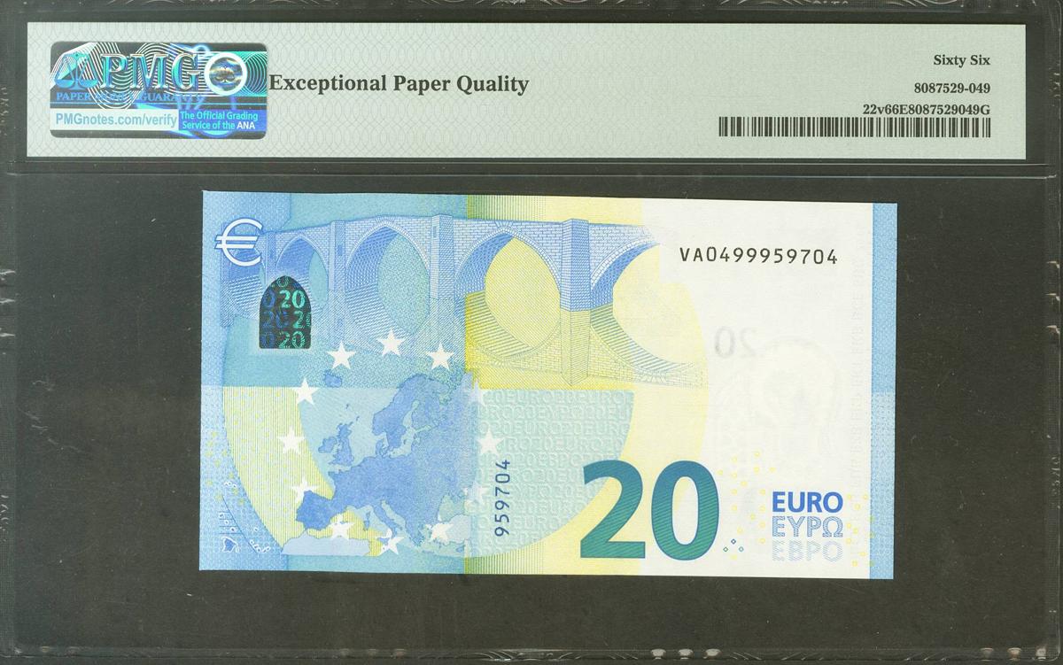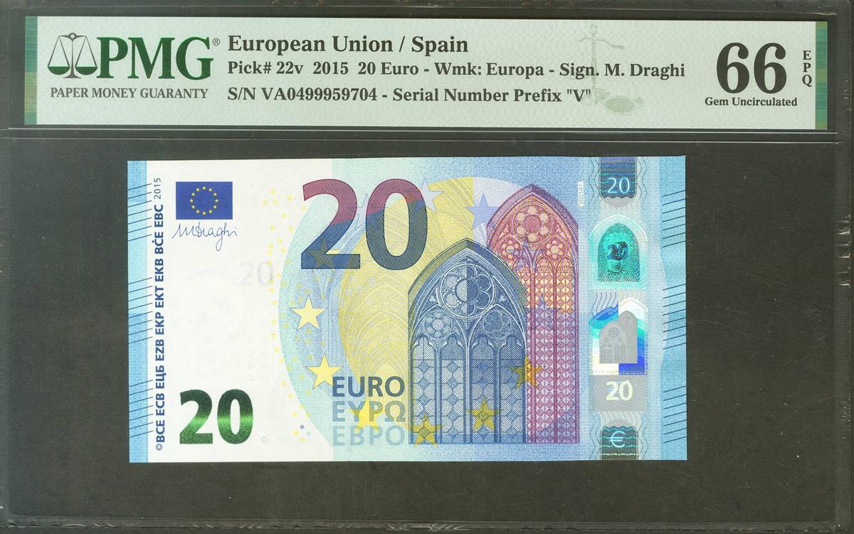 20 Euros. 25 de Noviembre de 2015. Firma Draghi. Serie V (España). (Edifil 2021: 495, Pick: 22v). SC. Encapsulado PMG66EPQ.
