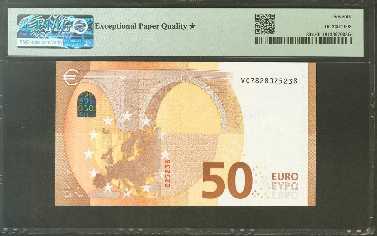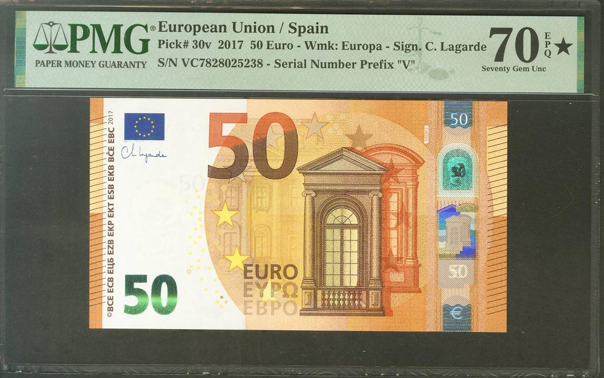 50 Euros. 4 de Abril de 2017. Firma Lagarde. Serie V (España) (Edifil 2017: 496A, Pick: 30v). Apresto original. SC. Encapsulado PMG70EPQ*.