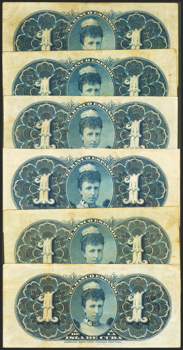 BANCO ESPAÑOL DE LA ISLA DE CUBA. Conjunto de 6 billetes de 1 Peso emitidos el 15 de Mayo de 1896, todos ellos con la serie G (Edifil 2021: 71). EBC-/MBC+.