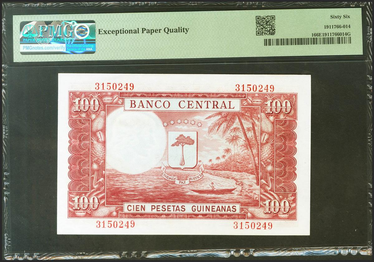 GUINEA ECUATORIAL. 100 Pesetas. 12 de Octubre de 1969. Sin serie. (Pick: 1). Raro en esta excepcional calidad, apresto original. SC. Encapsulado PMG66EPQ.