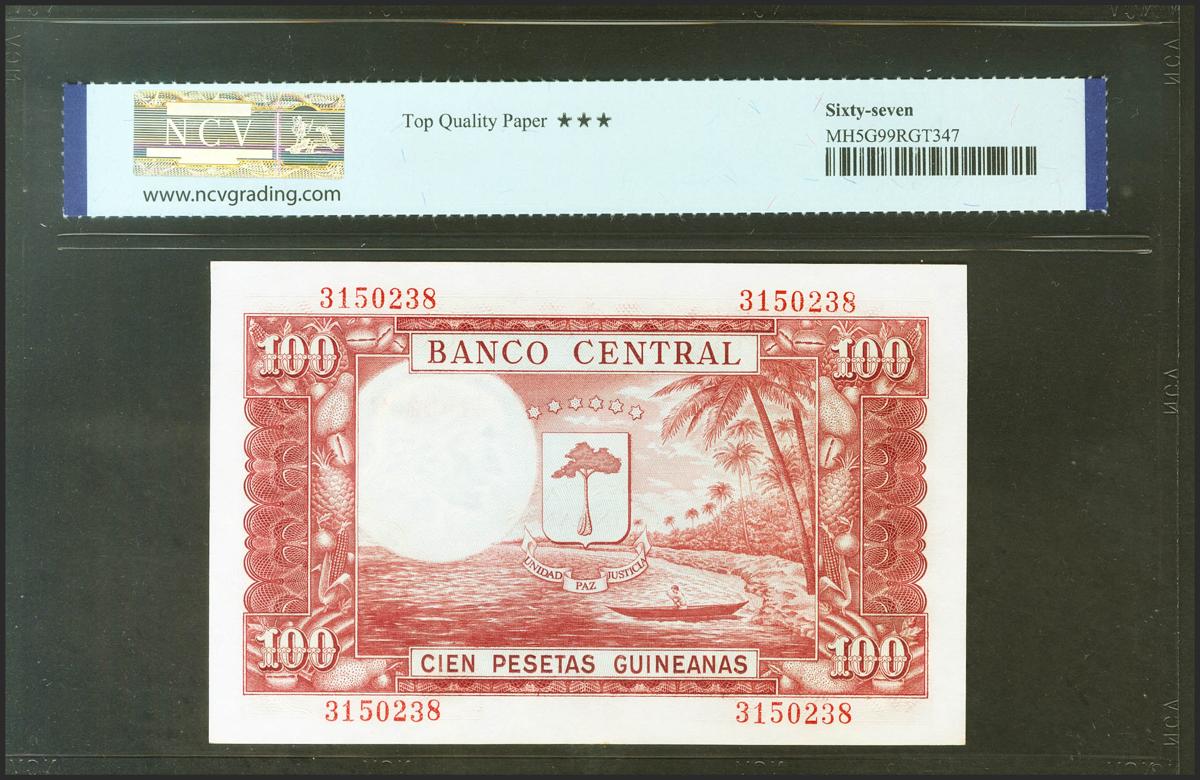 GUINEA ECUATORIAL. 100 Pesetas. 12 de Octubre de 1969. Sin serie. (Pick: 1). Extraordinariamente raro en esta excepcional calidad, apresto original. SC. Encapsulado NCV67TQP.